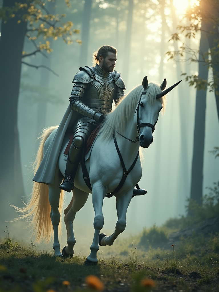 model riding a majestic white unicorn through a misty enchanted forest, wearing noble fantasy armor with mystical elements, ethereal morning light creating a dreamlike atmosphere