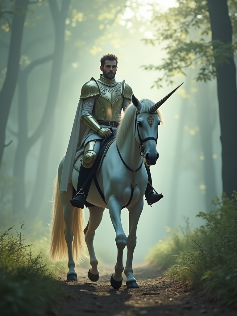 model riding a majestic white unicorn through a misty enchanted forest, wearing noble fantasy armor with mystical elements, ethereal morning light creating a dreamlike atmosphere