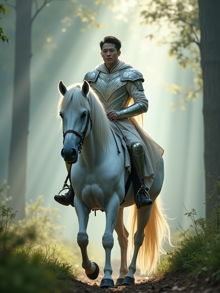 model riding a majestic white unicorn through a misty enchanted forest, wearing noble fantasy armor with mystical elements, ethereal morning light creating a dreamlike atmosphere