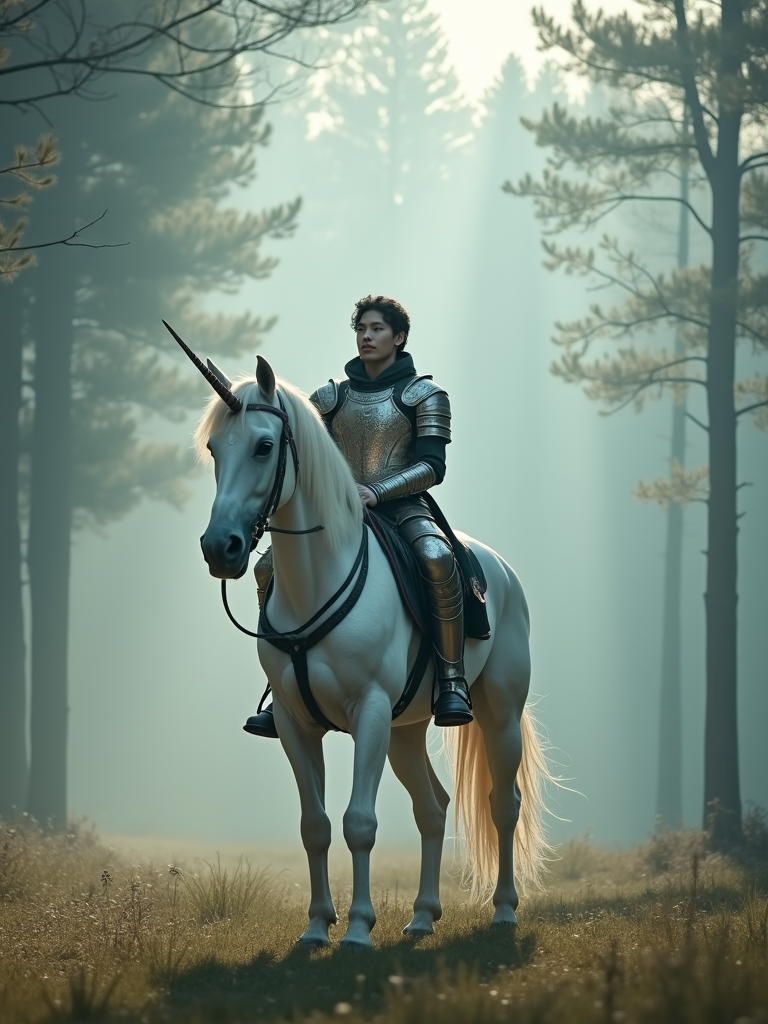 model riding a majestic white unicorn through a misty enchanted forest, wearing noble fantasy armor with mystical elements, ethereal morning light creating a dreamlike atmosphere