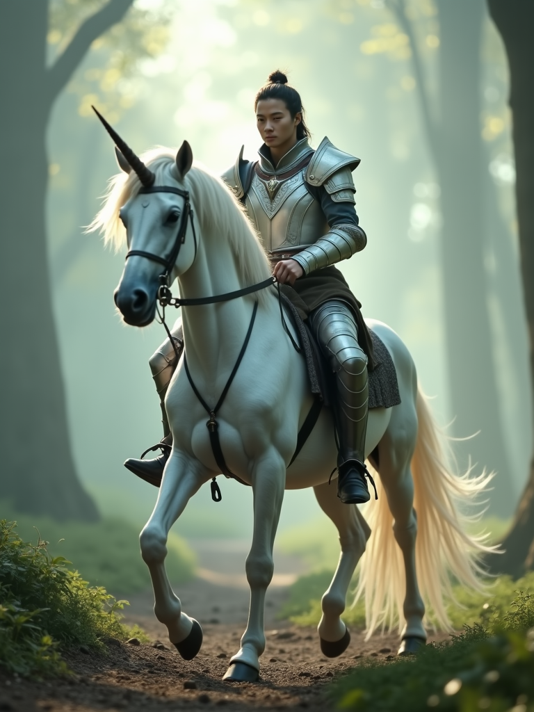 model riding a majestic white unicorn through a misty enchanted forest, wearing noble fantasy armor with mystical elements, ethereal morning light creating a dreamlike atmosphere