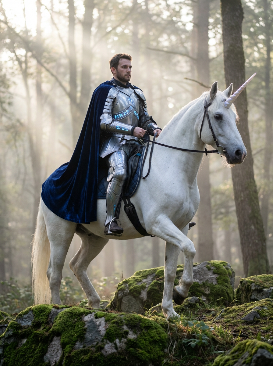 model riding a majestic white unicorn through a misty enchanted forest, wearing noble fantasy armor with mystical elements, ethereal morning light creating a dreamlike atmosphere
