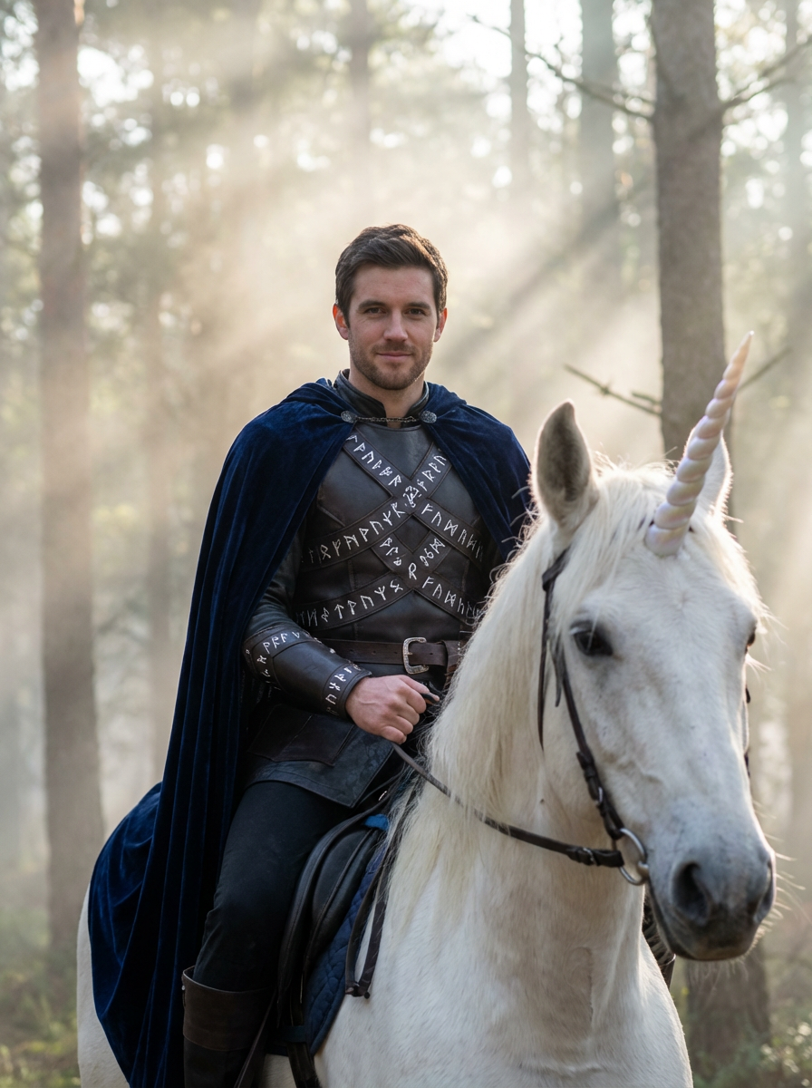 model riding a majestic white unicorn through a misty enchanted forest, wearing noble fantasy armor with mystical elements, ethereal morning light creating a dreamlike atmosphere