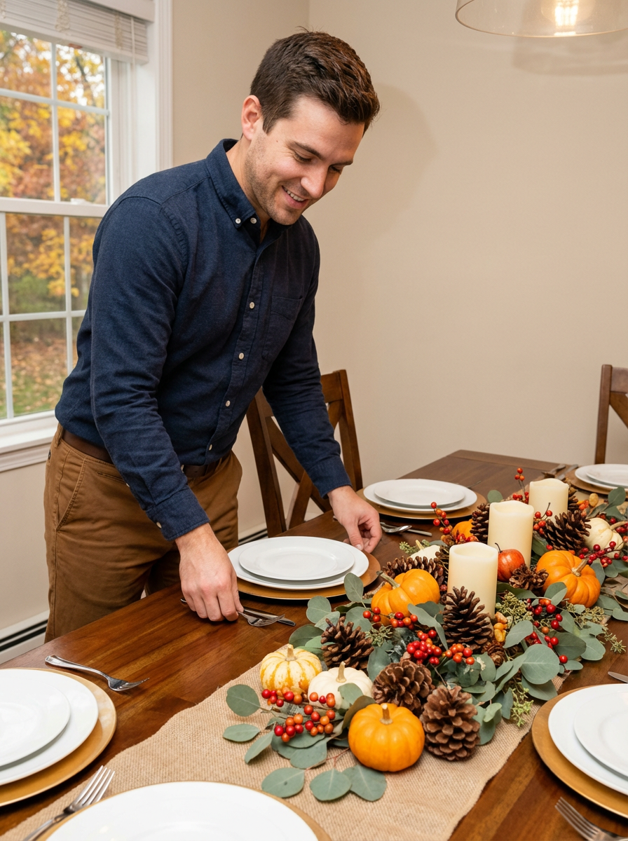 model setting holiday table, beautiful autumn centerpiece, elegant casual attire, hosting preparation