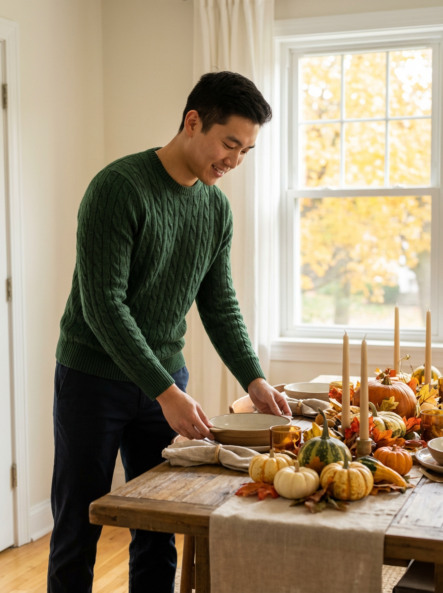 model setting holiday table, beautiful autumn centerpiece, elegant casual attire, hosting preparation