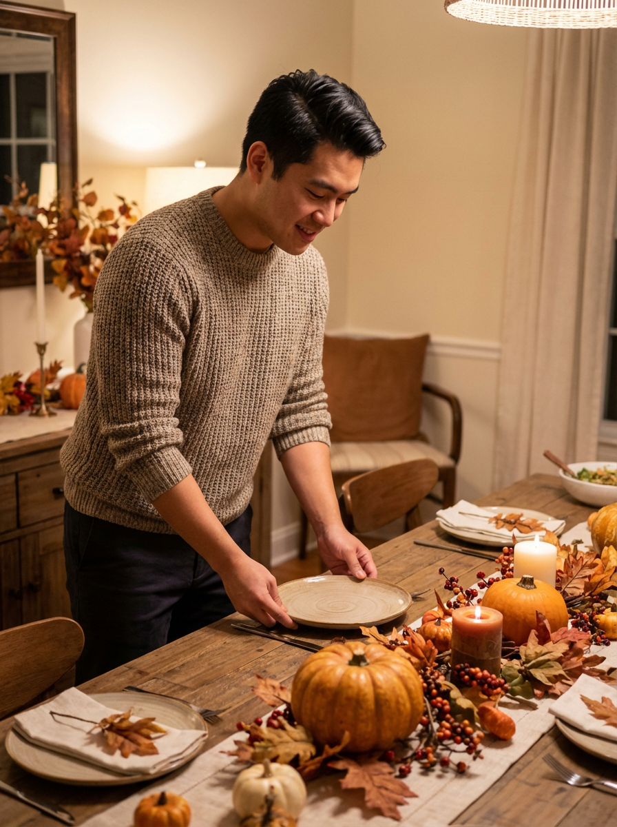 model setting holiday table, beautiful autumn centerpiece, elegant casual attire, hosting preparation