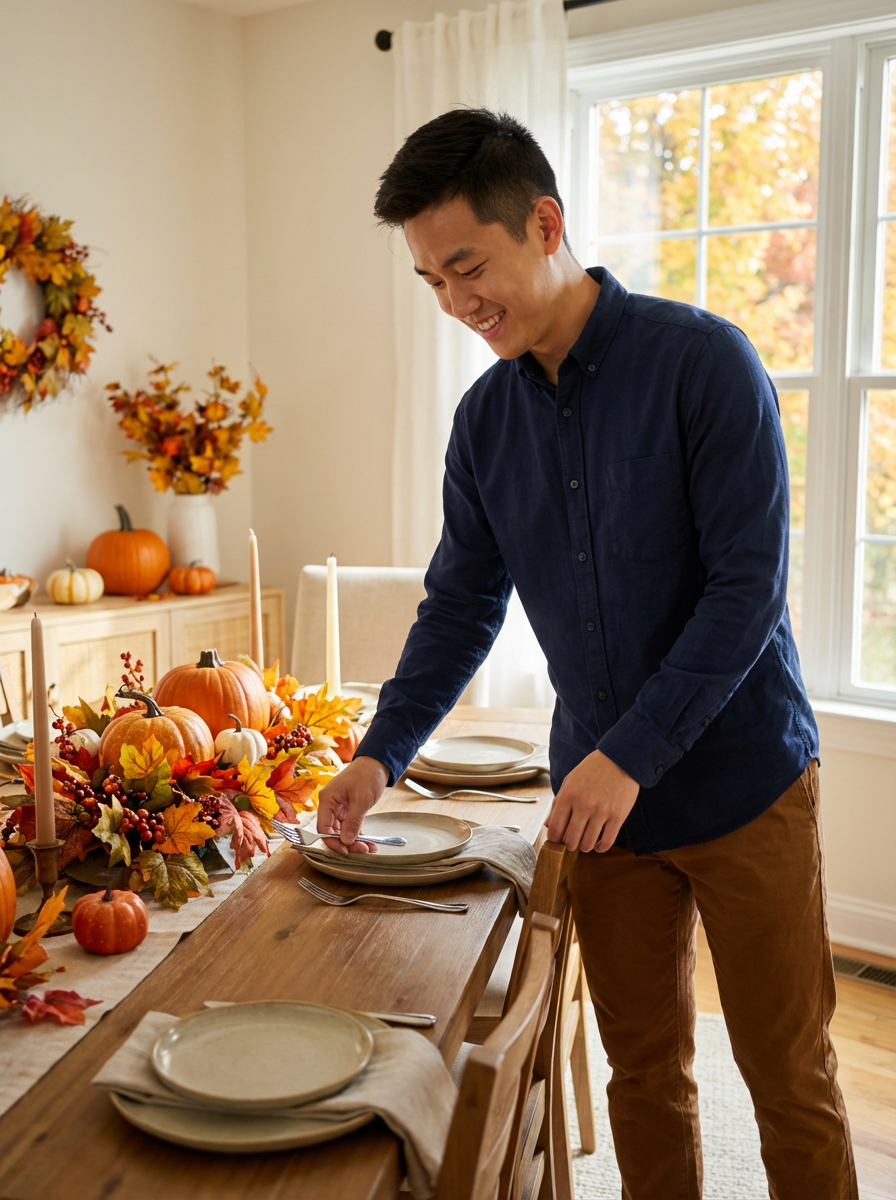 model setting holiday table, beautiful autumn centerpiece, elegant casual attire, hosting preparation