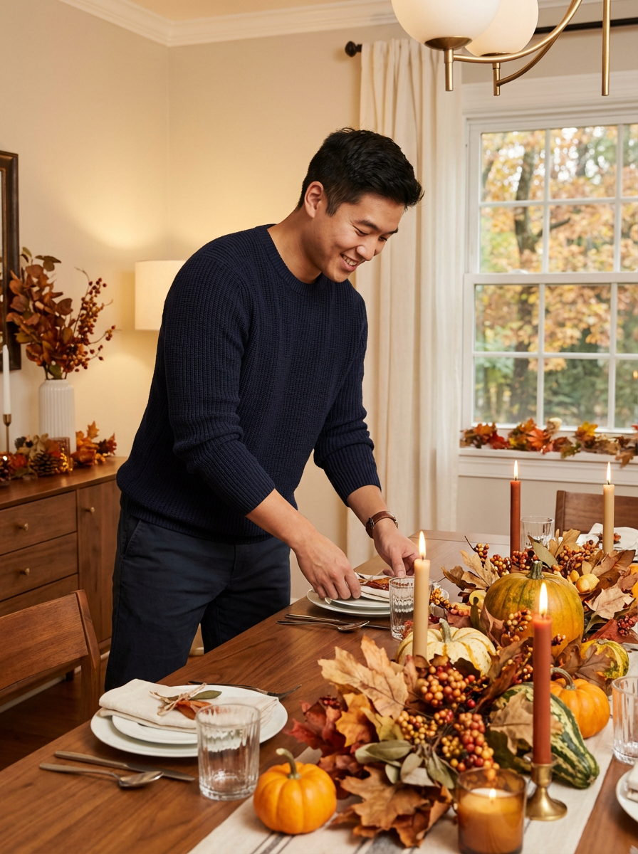 model setting holiday table, beautiful autumn centerpiece, elegant casual attire, hosting preparation
