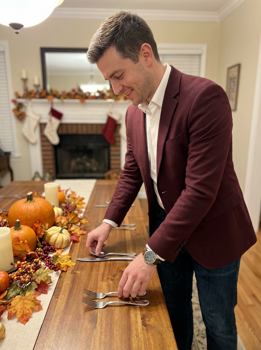 model setting holiday table, beautiful autumn centerpiece, elegant casual attire, hosting preparation
