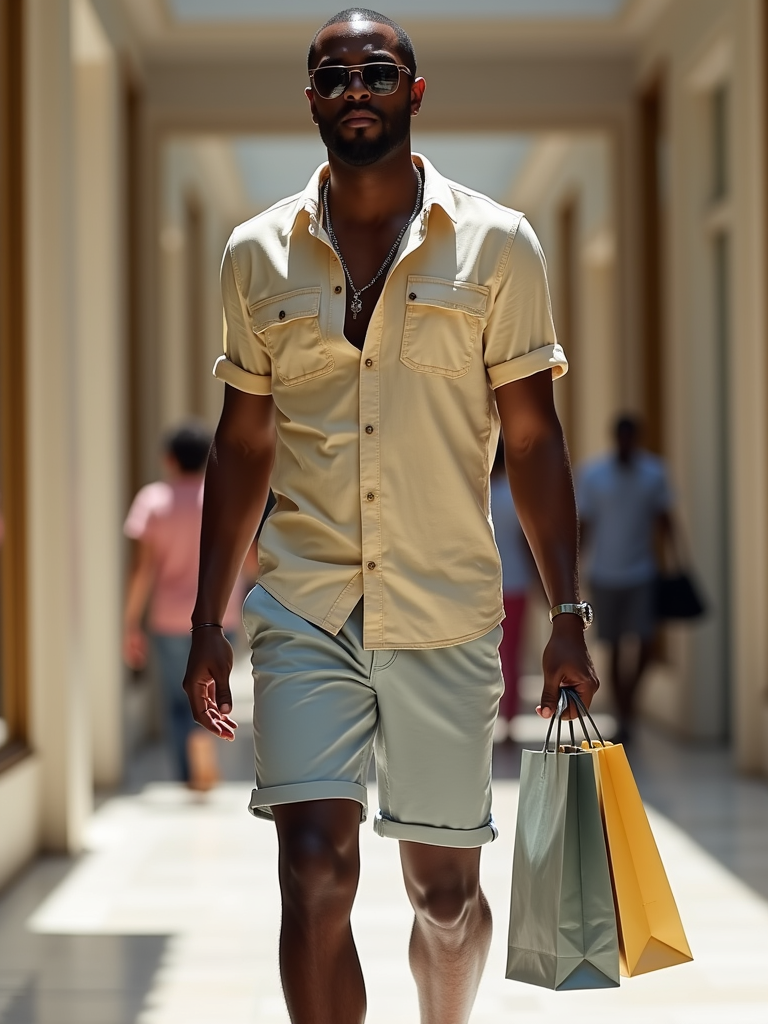 model shopping in Galeries Lafayette, wearing tailored shorts with a button-up shirt, carrying shopping bags