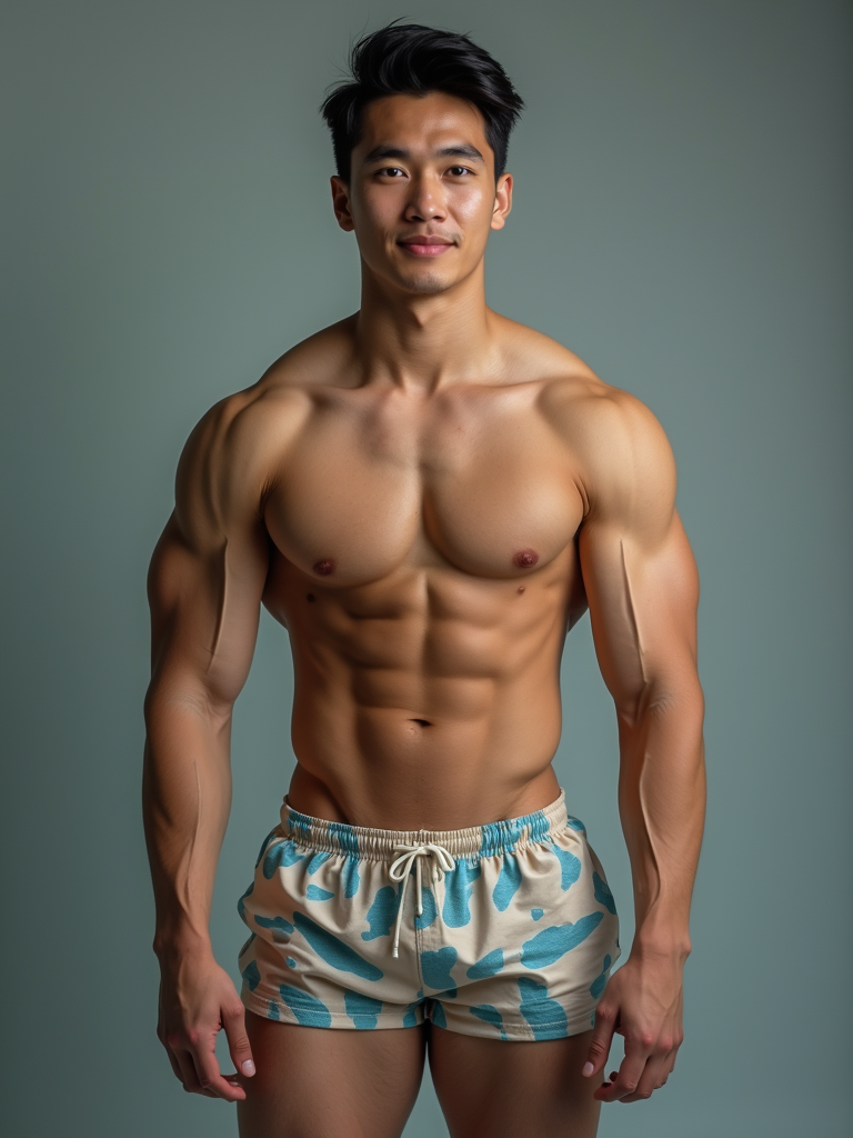 model showing their muscles looking into camera. model is wearing swim shorts the photo emphasizes their exaggerated, idealized body shapes.