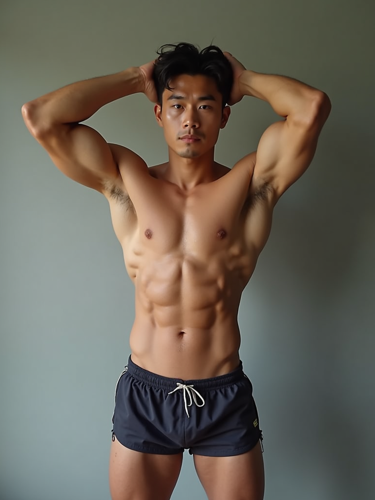 model showing their muscles looking into camera. model is wearing swim shorts the photo emphasizes their exaggerated, idealized body shapes.