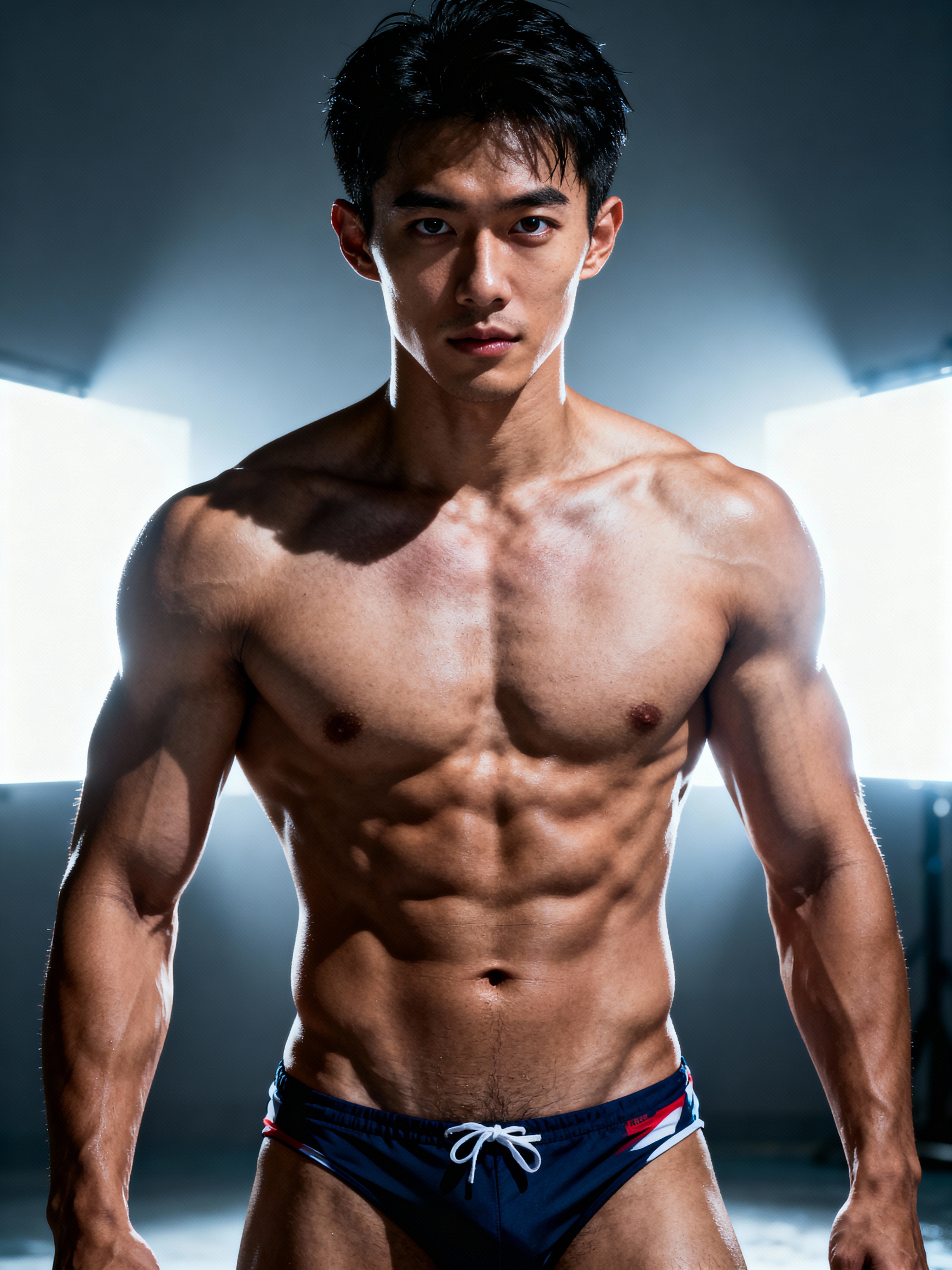model showing their muscles looking into camera. model is wearing swim shorts the photo emphasizes their exaggerated, idealized body shapes.