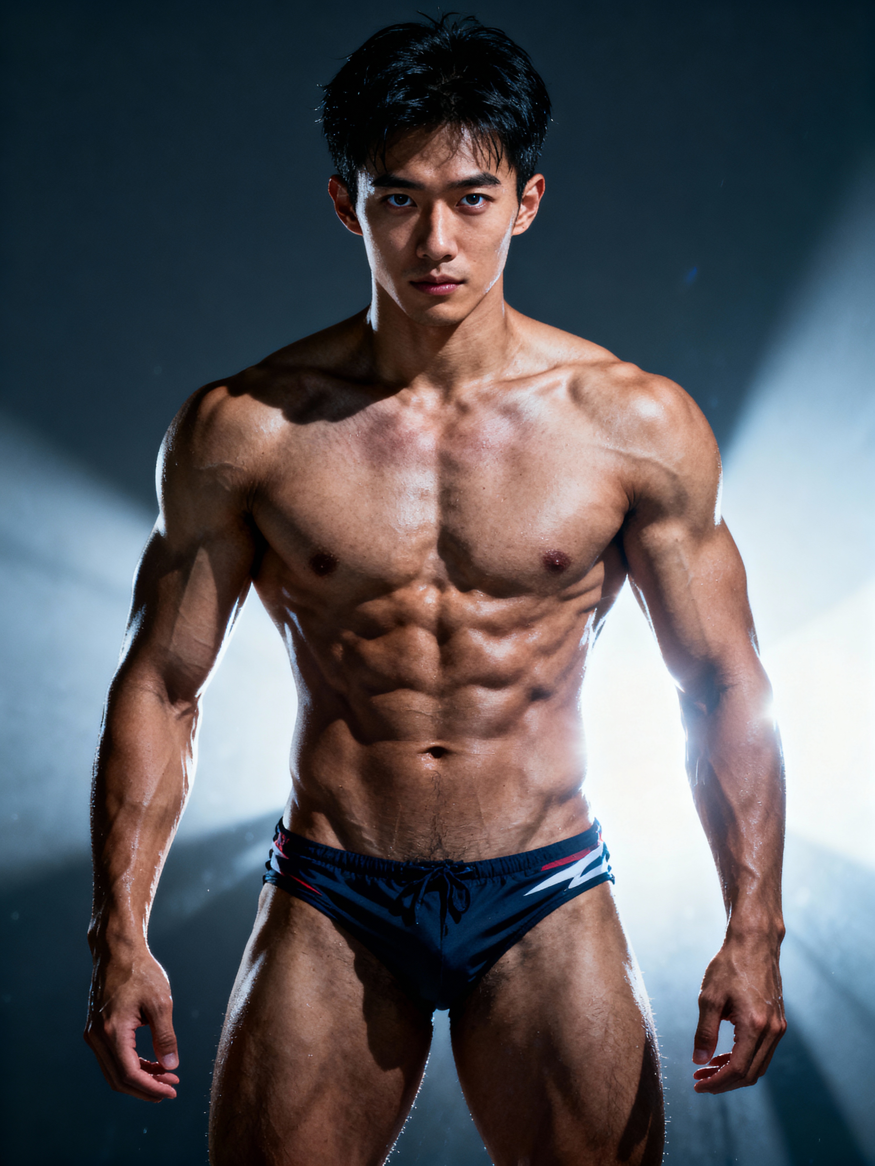 model showing their muscles looking into camera. model is wearing swim shorts the photo emphasizes their exaggerated, idealized body shapes.