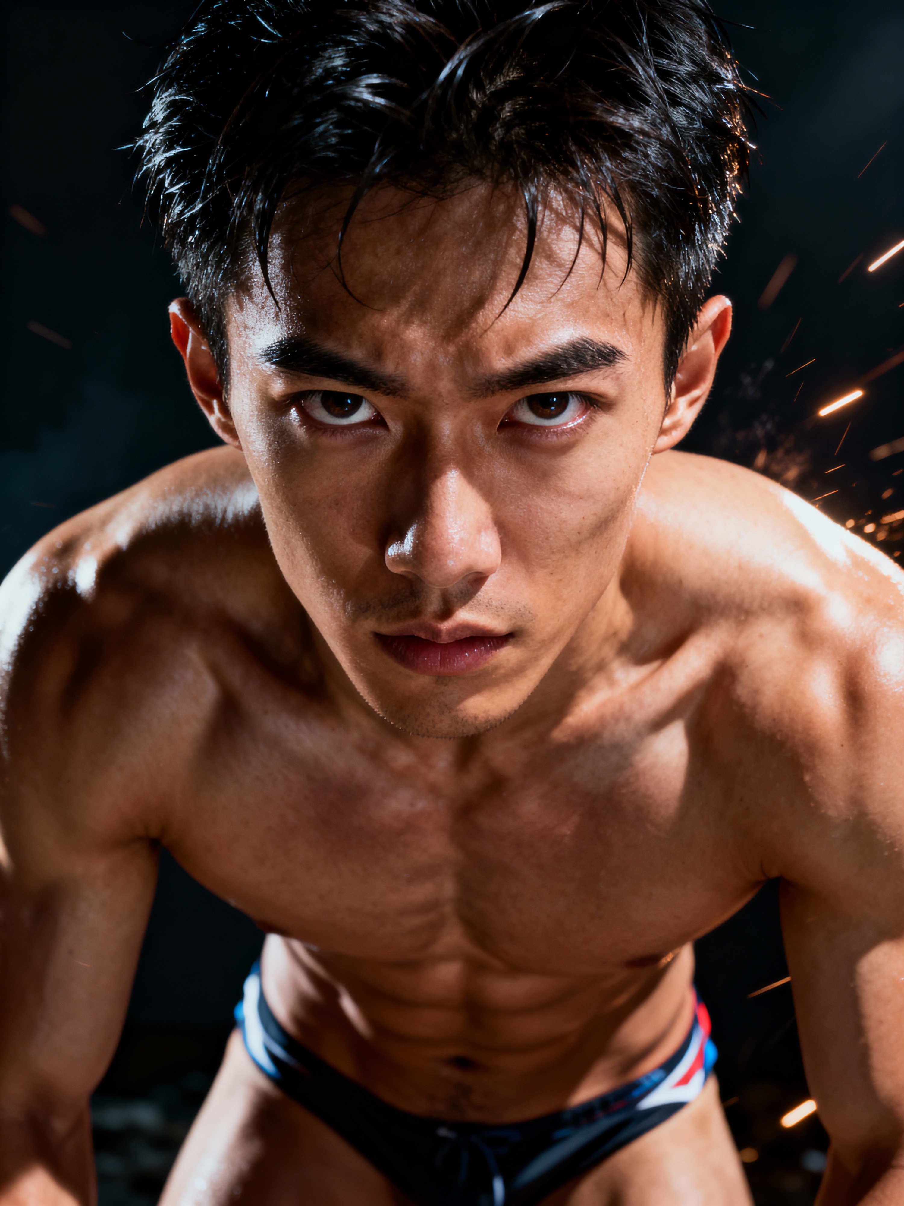 model showing their muscles looking into camera. model is wearing swim shorts the photo emphasizes their exaggerated, idealized body shapes.