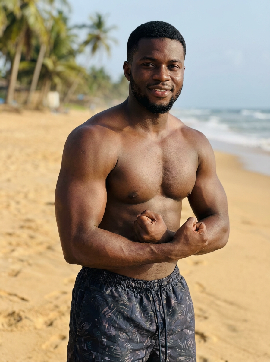 model showing their muscles looking into camera. model is wearing swim shorts the photo emphasizes their perfect body shapes.
