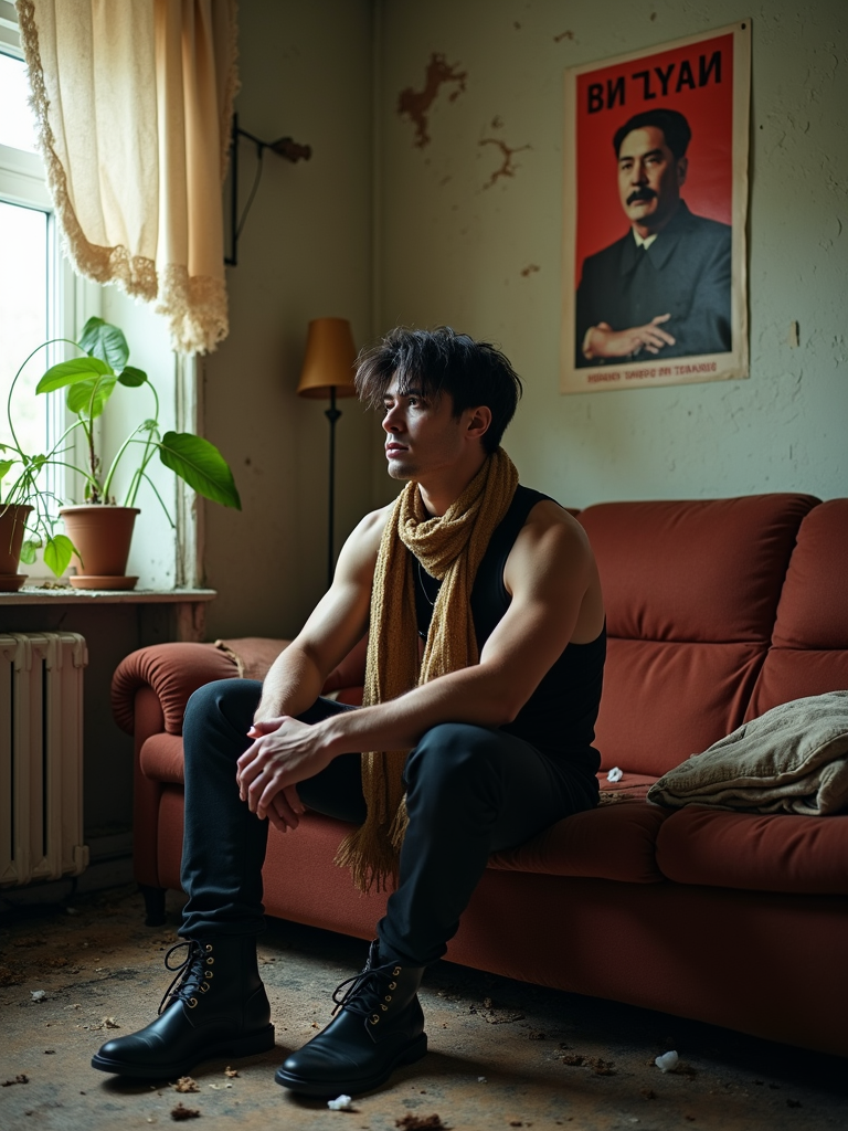 model sits on a dilapidated couch in a soviet-era apartment, wearing a faded scarf, with broken lamps and torn curtains surrounding the scene. plants growing from outside in. peeling wallpaper. poster of Stalin on wall. wearing black boots and black pants and black tank top.
