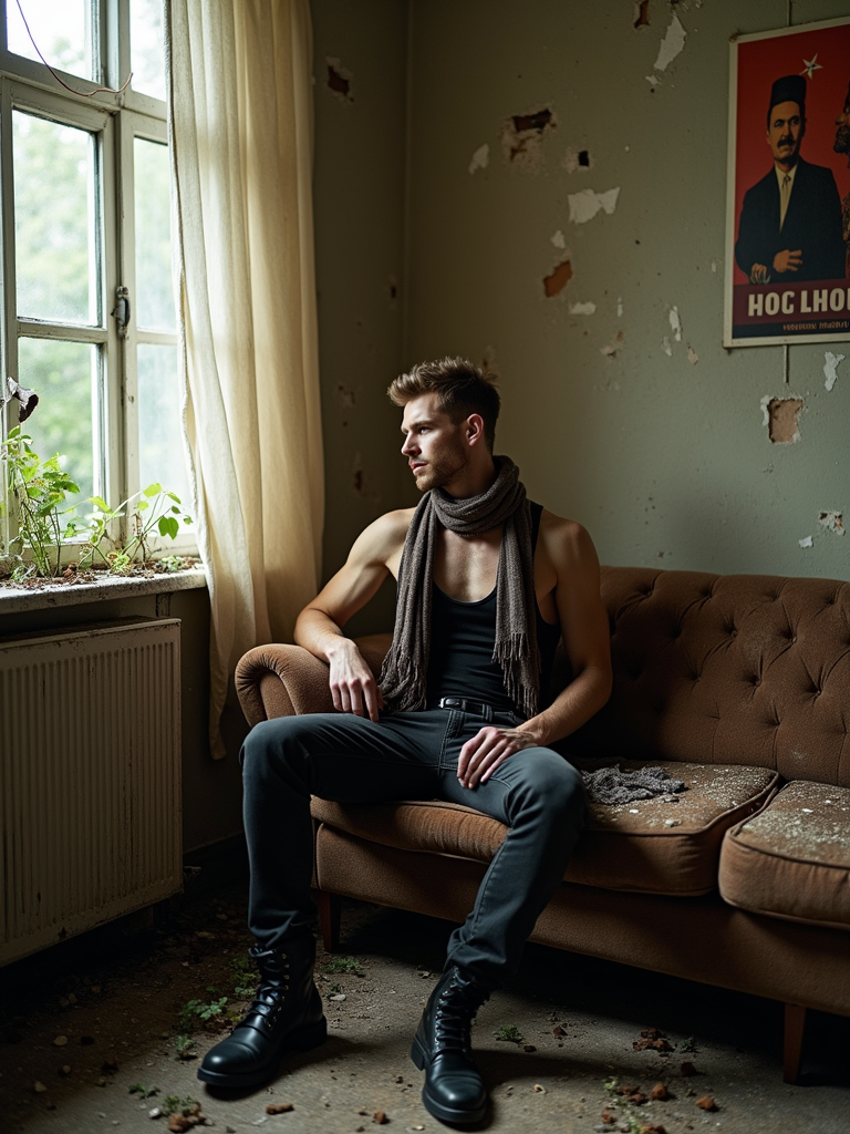 model sits on a dilapidated couch in a soviet-era apartment, wearing a faded scarf, with broken lamps and torn curtains surrounding the scene. plants growing from outside in. peeling wallpaper. poster of Stalin on wall. wearing black boots and black pants and black tank top.