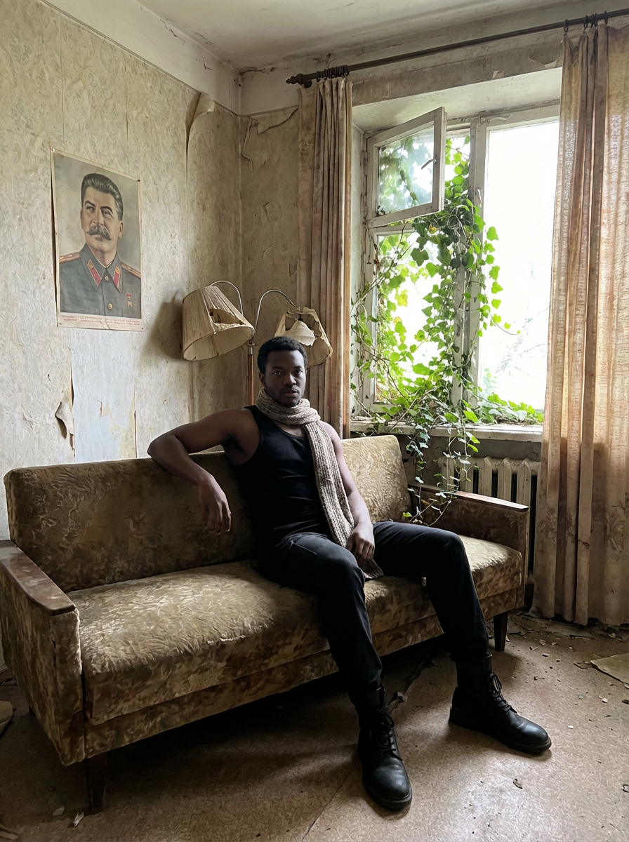 model sits on a dilapidated couch in a soviet-era apartment, wearing a faded scarf, with broken lamps and torn curtains surrounding the scene. plants growing from outside in. peeling wallpaper. poster of Stalin on wall. wearing black boots and black pants and black tank top.