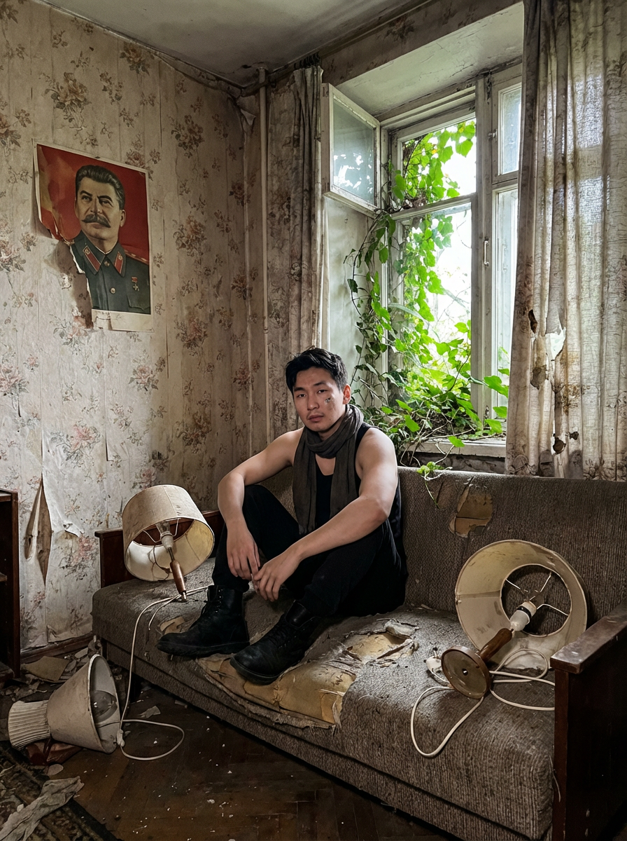 model sits on a dilapidated couch in a soviet-era apartment, wearing a faded scarf, with broken lamps and torn curtains surrounding the scene. plants growing from outside in. peeling wallpaper. poster of Stalin on wall. wearing black boots and black pants and black tank top.