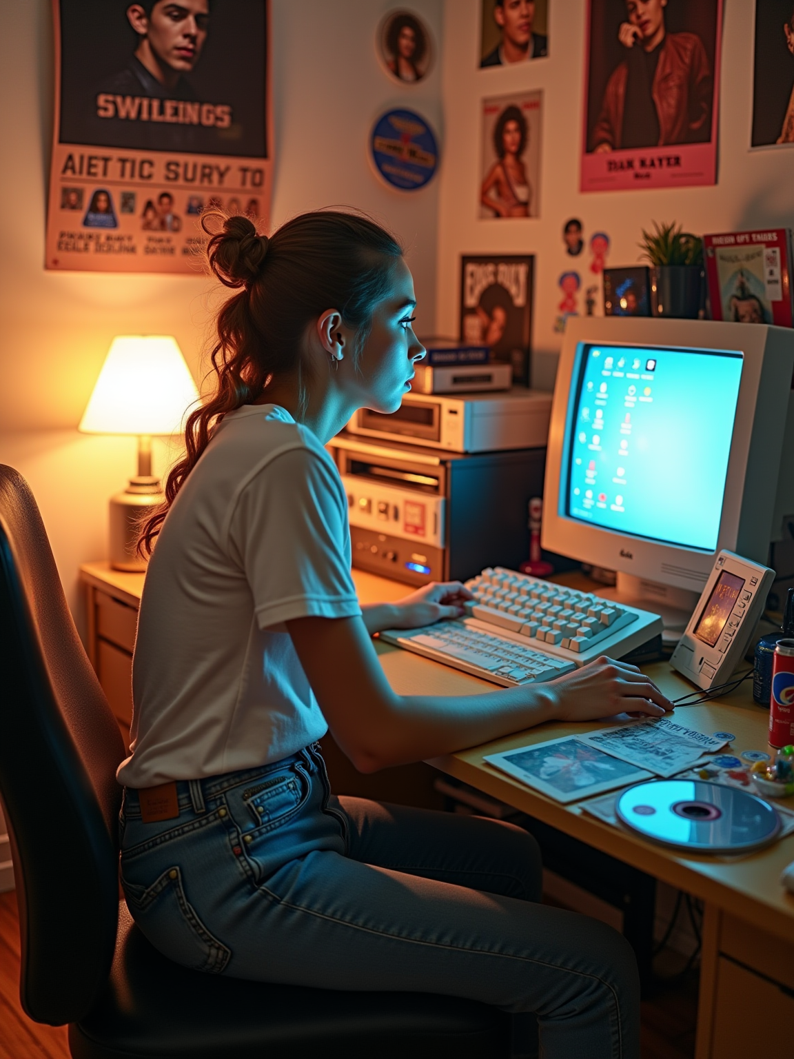model sitting at a 2000s themed desk setup. the model is dressed in early 2000s fashion, wearing a baby tee with low-rise jeans and chunky highlights, evoking Y2K nostalgia. her expression is one of curiosity and intrigue as she interacts with the old computer setup. large posters are pinned to the wall above the desk. To the right, a bulky CRT monitor displays a screensaver. The desk is cluttered with items including CD cases, a portable CD player, and a flip phone. A framed photograph is placed beside a Pepsi Twist bottle. Items like butterfly hair clips and NOW That's What I Call Music CDs are scattered across the desk, along with various holographic stickers and concert tickets. A lava lamp illuminates the workspace, and pop star posters and CD covers decorate the surrounding walls.