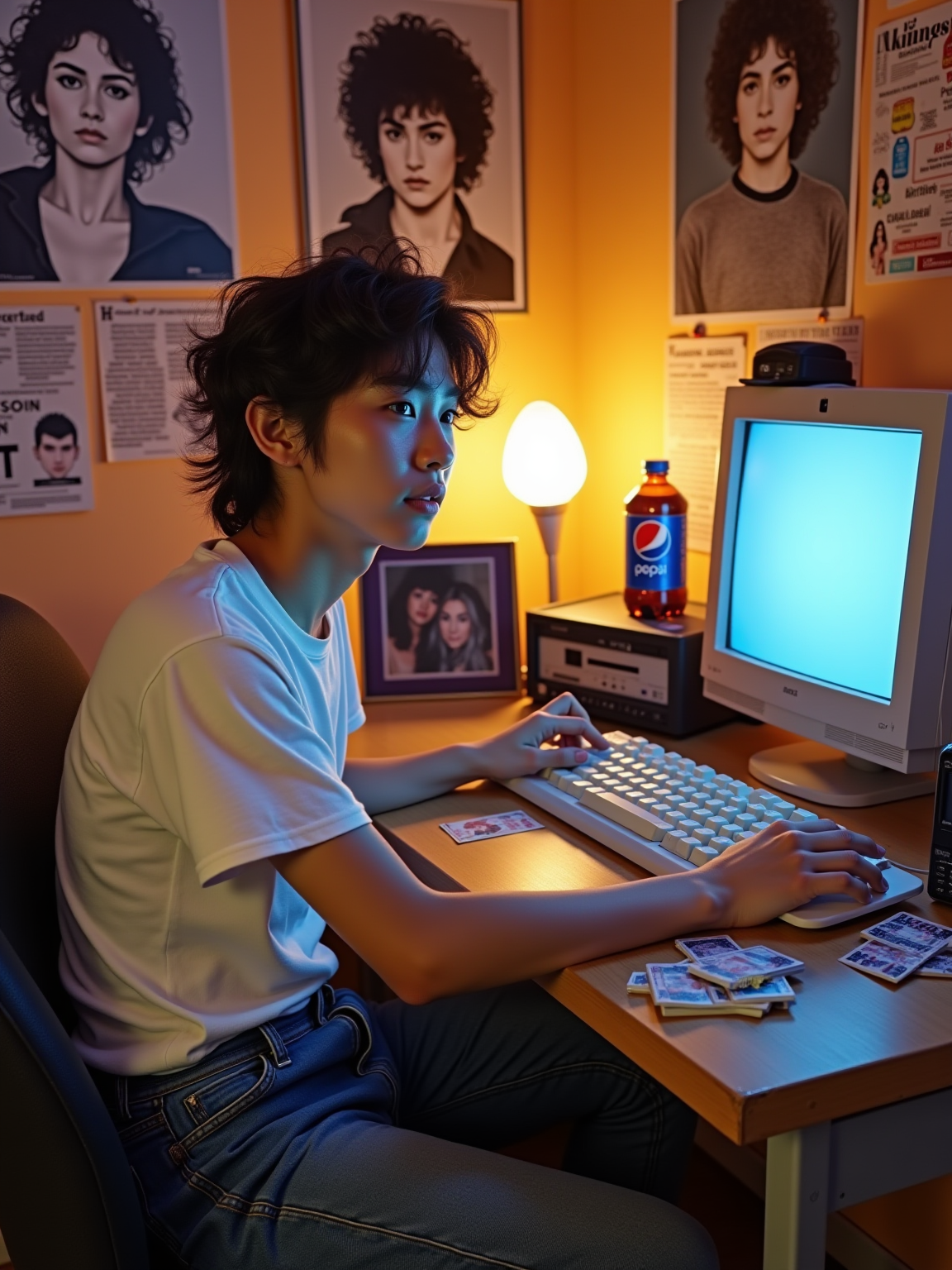model sitting at a 2000s themed desk setup. the model is dressed in early 2000s fashion, wearing a baby tee with low-rise jeans and chunky highlights, evoking Y2K nostalgia. her expression is one of curiosity and intrigue as she interacts with the old computer setup. large posters are pinned to the wall above the desk. To the right, a bulky CRT monitor displays a screensaver. The desk is cluttered with items including CD cases, a portable CD player, and a flip phone. A framed photograph is placed beside a Pepsi Twist bottle. Items like butterfly hair clips and NOW That's What I Call Music CDs are scattered across the desk, along with various holographic stickers and concert tickets. A lava lamp illuminates the workspace, and pop star posters and CD covers decorate the surrounding walls.