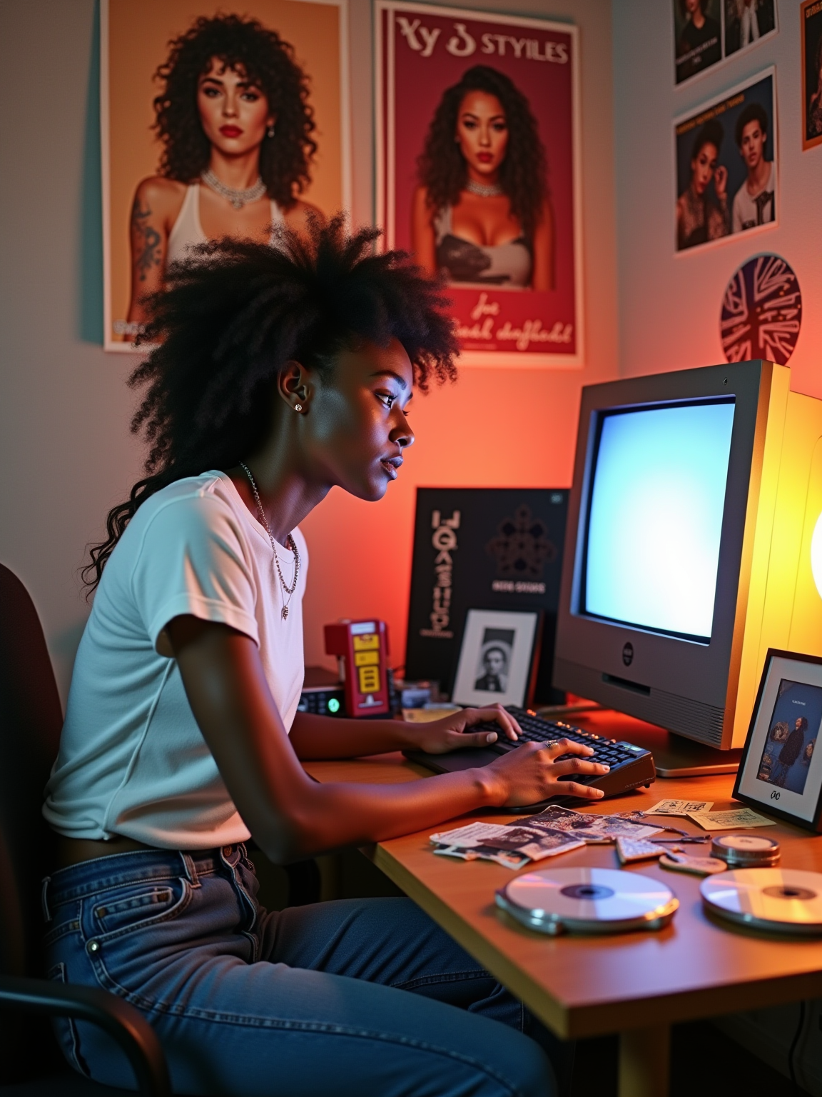 model sitting at a 2000s themed desk setup. the model is dressed in early 2000s fashion, wearing a baby tee with low-rise jeans and chunky highlights, evoking Y2K nostalgia. her expression is one of curiosity and intrigue as she interacts with the old computer setup. large posters are pinned to the wall above the desk. To the right, a bulky CRT monitor displays a screensaver. The desk is cluttered with items including CD cases, a portable CD player, and a flip phone. A framed photograph is placed beside a Pepsi Twist bottle. Items like butterfly hair clips and NOW That's What I Call Music CDs are scattered across the desk, along with various holographic stickers and concert tickets. A lava lamp illuminates the workspace, and pop star posters and CD covers decorate the surrounding walls.