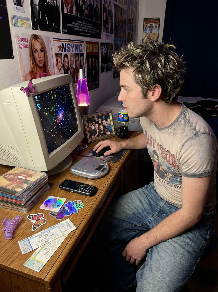 model sitting at a 2000s themed desk setup. the model is dressed in early 2000s fashion, wearing a baby tee with low-rise jeans and chunky highlights, evoking Y2K nostalgia. her expression is one of curiosity and intrigue as she interacts with the old computer setup. large posters are pinned to the wall above the desk. To the right, a bulky CRT monitor displays a screensaver. The desk is cluttered with items including CD cases, a portable CD player, and a flip phone. A framed photograph is placed beside a Pepsi Twist bottle. Items like butterfly hair clips and NOW That's What I Call Music CDs are scattered across the desk, along with various holographic stickers and concert tickets. A lava lamp illuminates the workspace, and pop star posters and CD covers decorate the surrounding walls.