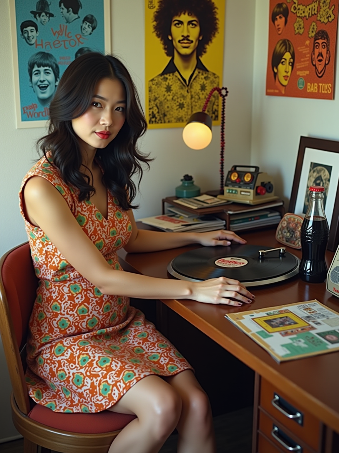 model sitting at a 60s themed desk setup. the model is dressed in 1960s fashion, wearing a colorful geometric patterned shift dress and go-go boots, evoking a sense of mod nostalgia. her expression is one of curiosity and intrigue as she interacts with the old turntable. large posters are pinned to the wall above the desk. To the right, a vintage stereo with record player displays spinning vinyl. The desk is cluttered with items including vinyl 45s, a transistor radio, and a rotary phone. A framed photograph is placed beside a Tab cola bottle. Items like peace sign jewelry and Beatles albums are scattered across the desk, along with various flower power stickers and concert tickets. A beaded lamp illuminates the workspace, and psychedelic posters and album covers decorate the surrounding walls.