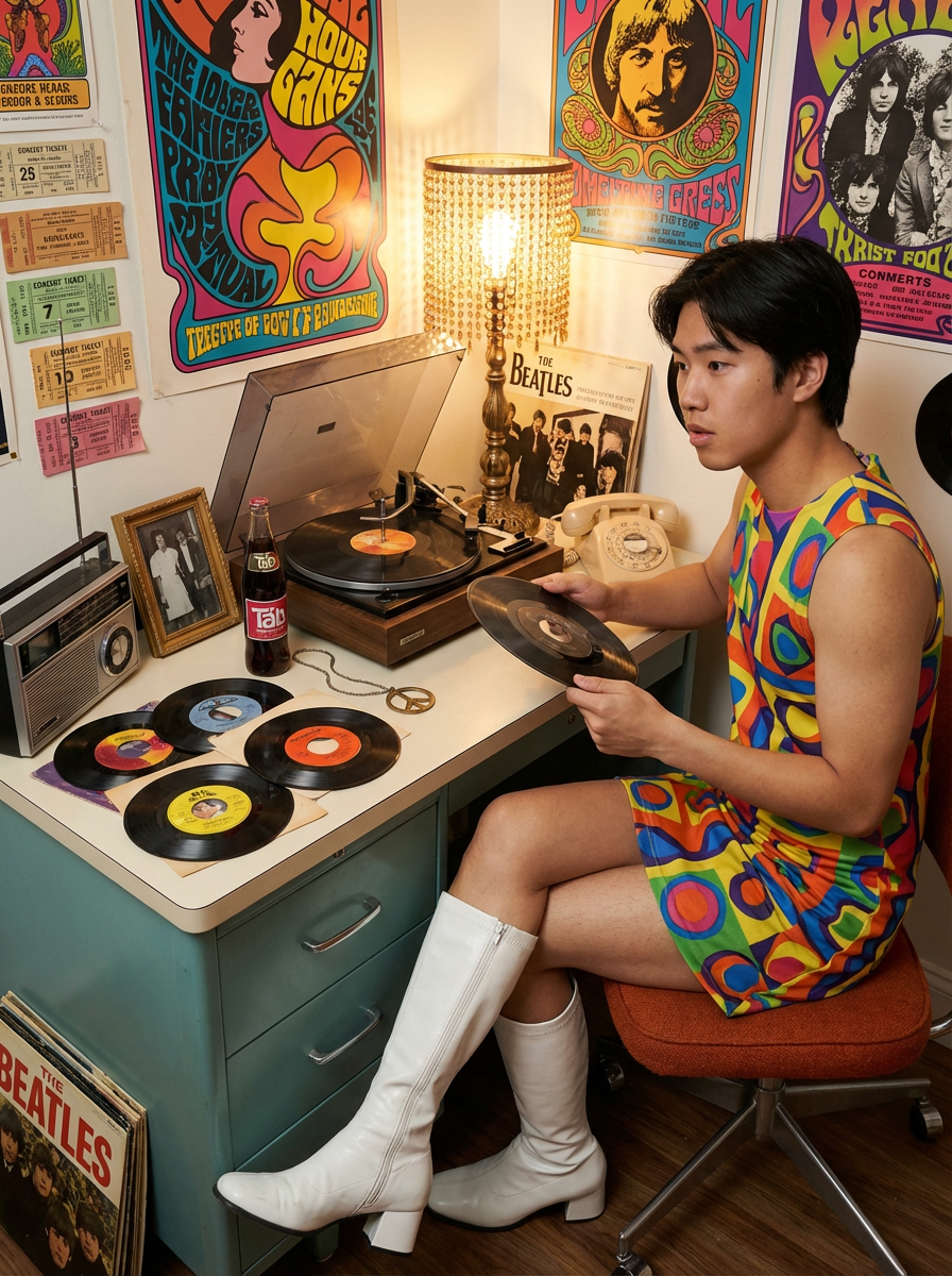 model sitting at a 60s themed desk setup. the model is dressed in 1960s fashion, wearing a colorful geometric patterned shift dress and go-go boots, evoking a sense of mod nostalgia. her expression is one of curiosity and intrigue as she interacts with the old turntable. large posters are pinned to the wall above the desk. To the right, a vintage stereo with record player displays spinning vinyl. The desk is cluttered with items including vinyl 45s, a transistor radio, and a rotary phone. A framed photograph is placed beside a Tab cola bottle. Items like peace sign jewelry and Beatles albums are scattered across the desk, along with various flower power stickers and concert tickets. A beaded lamp illuminates the workspace, and psychedelic posters and album covers decorate the surrounding walls.