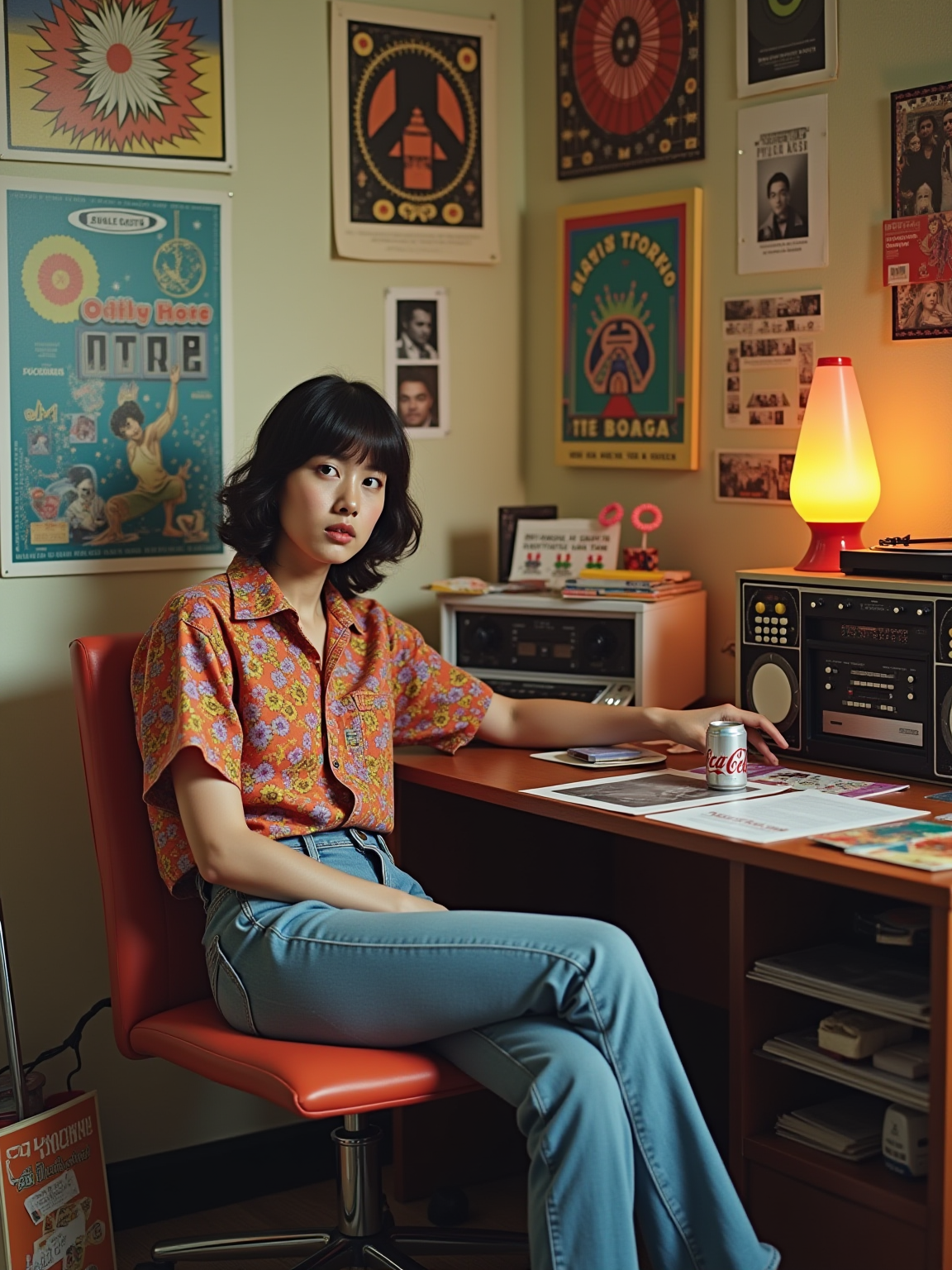 model sitting at a 70s themed desk setup. the model is dressed in 1970s fashion, wearing a colorful psychedelic shirt and bell-bottom jeans, evoking a sense of groovy nostalgia. her expression is one of curiosity and intrigue as she interacts with the old stereo system. large posters are pinned to the wall above the desk. To the right, a vintage stereo with large speakers displays a turntable. The desk is cluttered with items including vinyl records, a lava lamp, and an 8-track player. A framed photograph is placed beside a Tab cola can. Toys, like a mood ring and record albums, are scattered across the desk, along with various peace sign stickers and concert tickets. A beaded lamp illuminates the workspace, and groovy posters and album covers decorate the surrounding walls.