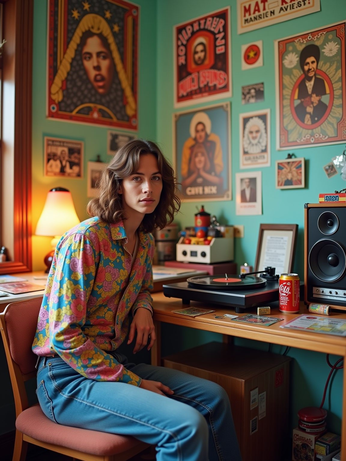 model sitting at a 70s themed desk setup. the model is dressed in 1970s fashion, wearing a colorful psychedelic shirt and bell-bottom jeans, evoking a sense of groovy nostalgia. her expression is one of curiosity and intrigue as she interacts with the old stereo system. large posters are pinned to the wall above the desk. To the right, a vintage stereo with large speakers displays a turntable. The desk is cluttered with items including vinyl records, a lava lamp, and an 8-track player. A framed photograph is placed beside a Tab cola can. Toys, like a mood ring and record albums, are scattered across the desk, along with various peace sign stickers and concert tickets. A beaded lamp illuminates the workspace, and groovy posters and album covers decorate the surrounding walls.