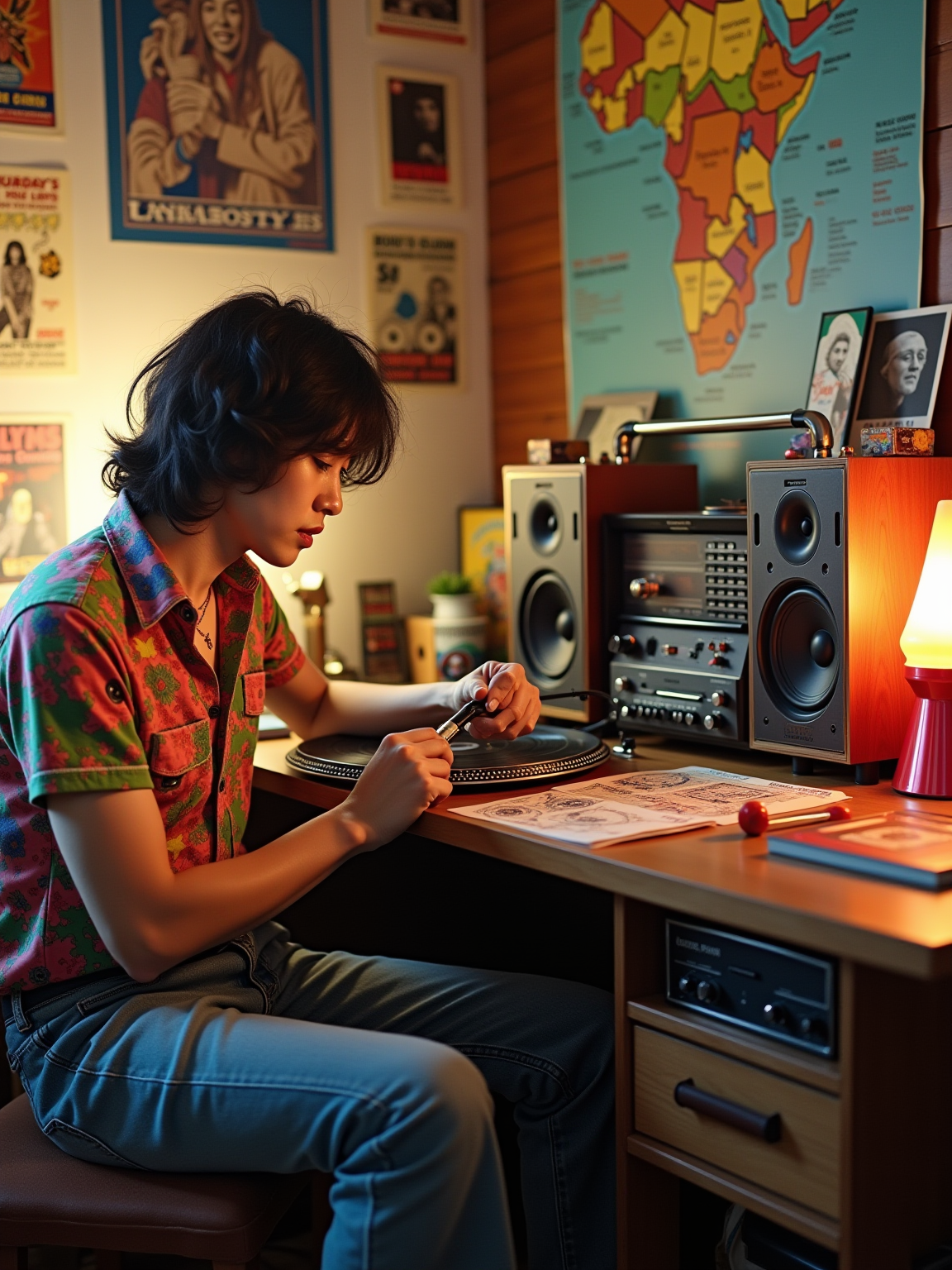 model sitting at a 70s themed desk setup. the model is dressed in 1970s fashion, wearing a colorful psychedelic shirt and bell-bottom jeans, evoking a sense of groovy nostalgia. her expression is one of curiosity and intrigue as she interacts with the old stereo system. large posters are pinned to the wall above the desk. To the right, a vintage stereo with large speakers displays a turntable. The desk is cluttered with items including vinyl records, a lava lamp, and an 8-track player. A framed photograph is placed beside a Tab cola can. Toys, like a mood ring and record albums, are scattered across the desk, along with various peace sign stickers and concert tickets. A beaded lamp illuminates the workspace, and groovy posters and album covers decorate the surrounding walls.