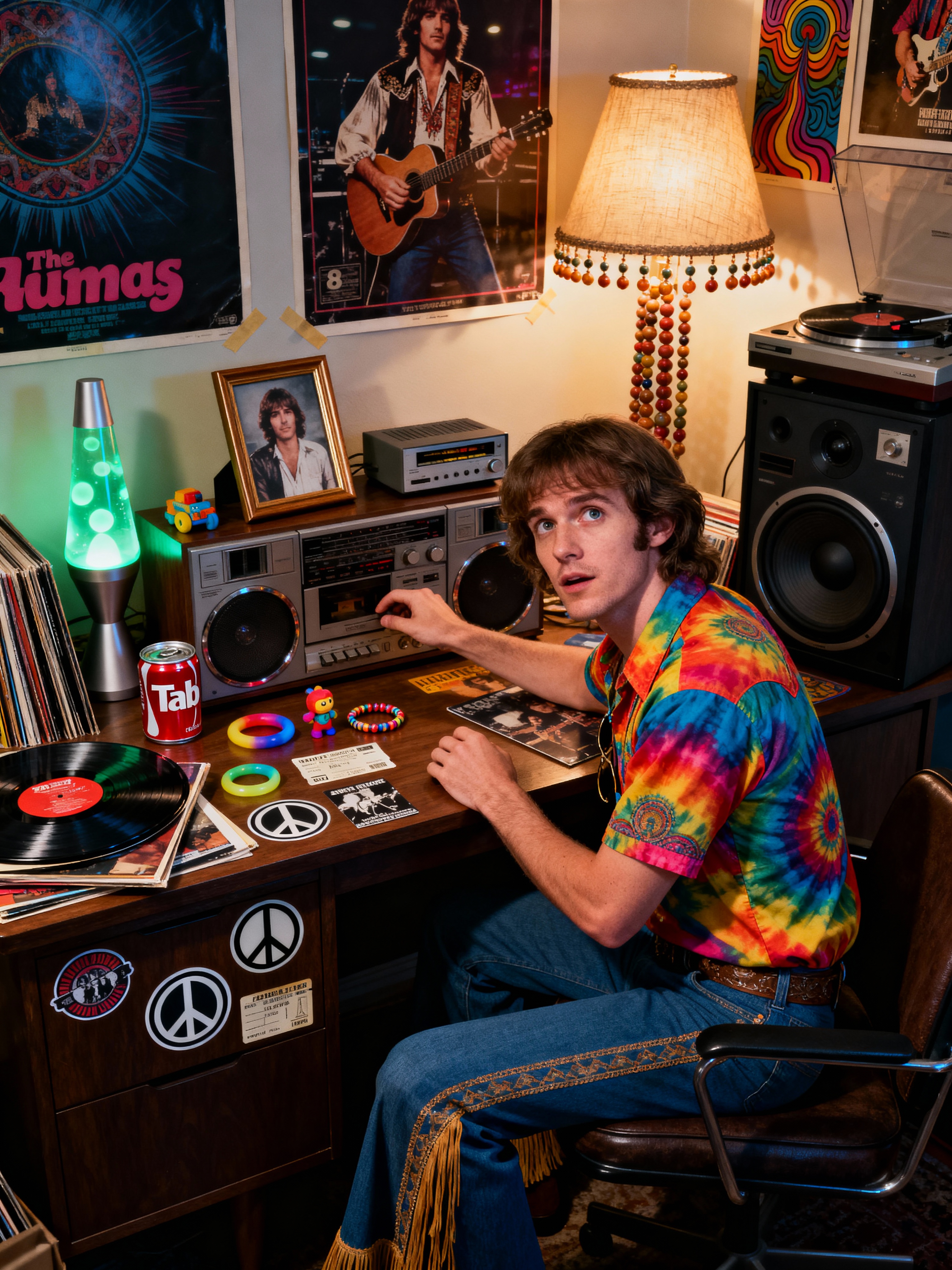 model sitting at a 70s themed desk setup. the model is dressed in 1970s fashion, wearing a colorful psychedelic shirt and bell-bottom jeans, evoking a sense of groovy nostalgia. her expression is one of curiosity and intrigue as she interacts with the old stereo system. large posters are pinned to the wall above the desk. To the right, a vintage stereo with large speakers displays a turntable. The desk is cluttered with items including vinyl records, a lava lamp, and an 8-track player. A framed photograph is placed beside a Tab cola can. Toys, like a mood ring and record albums, are scattered across the desk, along with various peace sign stickers and concert tickets. A beaded lamp illuminates the workspace, and groovy posters and album covers decorate the surrounding walls.
