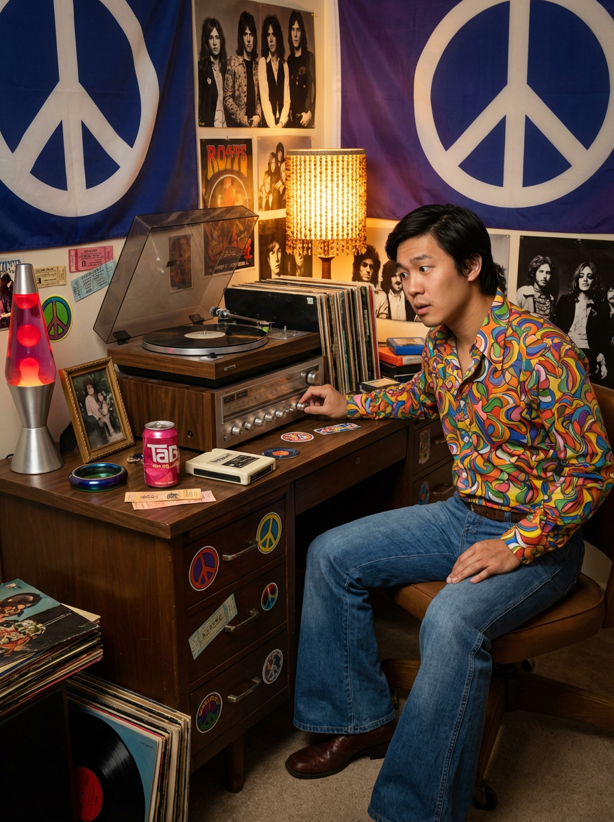 model sitting at a 70s themed desk setup. the model is dressed in 1970s fashion, wearing a colorful psychedelic shirt and bell-bottom jeans, evoking a sense of groovy nostalgia. her expression is one of curiosity and intrigue as she interacts with the old stereo system. large posters are pinned to the wall above the desk. To the right, a vintage stereo with large speakers displays a turntable. The desk is cluttered with items including vinyl records, a lava lamp, and an 8-track player. A framed photograph is placed beside a Tab cola can. Toys, like a mood ring and record albums, are scattered across the desk, along with various peace sign stickers and concert tickets. A beaded lamp illuminates the workspace, and groovy posters and album covers decorate the surrounding walls.