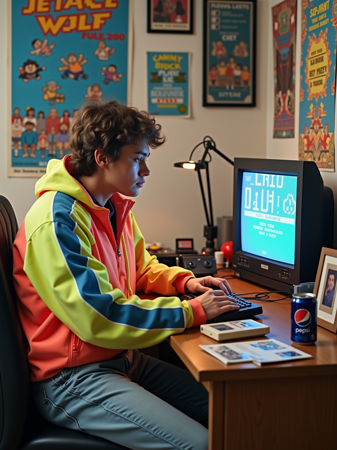 model sitting at a 80s themed desk setup. the model is dressed in 1980s fashion, wearing a neon windbreaker and high-waisted acid wash jeans, evoking a sense of nostalgia. her expression is one of curiosity and intrigue as she interacts with the old computer. large posters are pinned to the wall above the desk. To the right, a vintage computer monitor displays a pixelated game screen. The desk is cluttered with items including a joystick, a cassette player, and a calculator. A framed photograph of a child is placed beside a Pepsi can. Toys, like a toy truck and cassette cases, are scattered across the desk, along with various gaming-related stickers and cards. An adjustable desk lamp illuminates the workspace, and colorful posters and flyers decorate the surrounding walls.