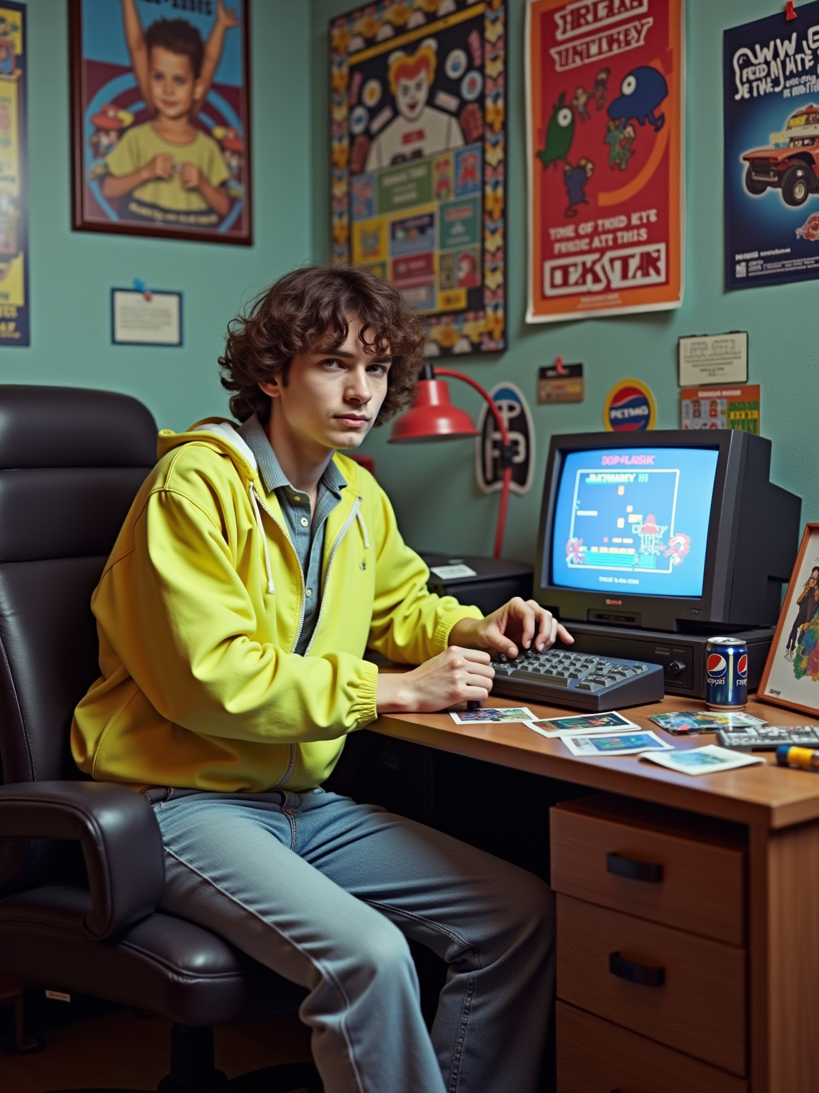model sitting at a 80s themed desk setup. the model is dressed in 1980s fashion, wearing a neon windbreaker and high-waisted acid wash jeans, evoking a sense of nostalgia. her expression is one of curiosity and intrigue as she interacts with the old computer. large posters are pinned to the wall above the desk. To the right, a vintage computer monitor displays a pixelated game screen. The desk is cluttered with items including a joystick, a cassette player, and a calculator. A framed photograph of a child is placed beside a Pepsi can. Toys, like a toy truck and cassette cases, are scattered across the desk, along with various gaming-related stickers and cards. An adjustable desk lamp illuminates the workspace, and colorful posters and flyers decorate the surrounding walls.