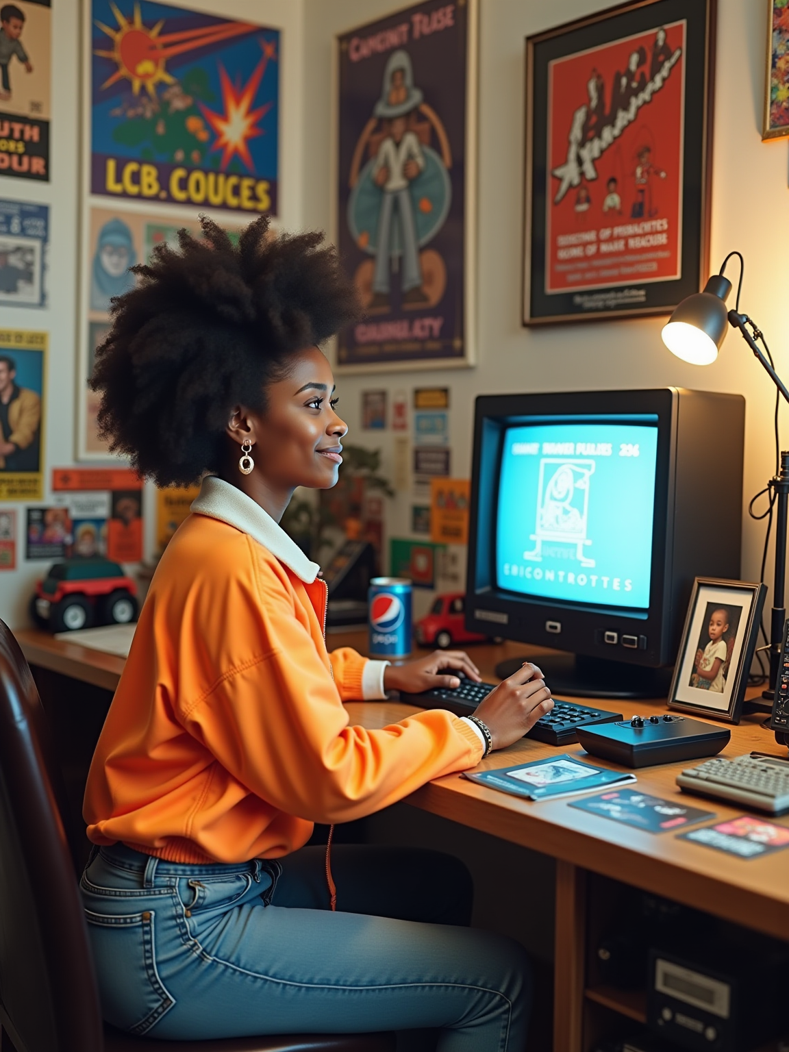 model sitting at a 80s themed desk setup. the model is dressed in 1980s fashion, wearing a neon windbreaker and high-waisted acid wash jeans, evoking a sense of nostalgia. her expression is one of curiosity and intrigue as she interacts with the old computer. large posters are pinned to the wall above the desk. To the right, a vintage computer monitor displays a pixelated game screen. The desk is cluttered with items including a joystick, a cassette player, and a calculator. A framed photograph of a child is placed beside a Pepsi can. Toys, like a toy truck and cassette cases, are scattered across the desk, along with various gaming-related stickers and cards. An adjustable desk lamp illuminates the workspace, and colorful posters and flyers decorate the surrounding walls.