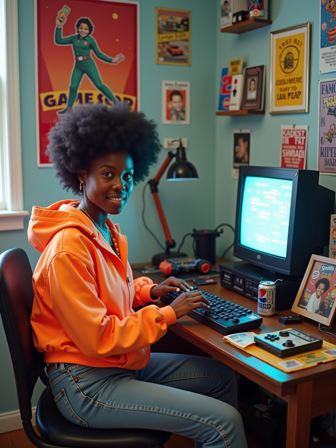 model sitting at a 80s themed desk setup. the model is dressed in 1980s fashion, wearing a neon windbreaker and high-waisted acid wash jeans, evoking a sense of nostalgia. her expression is one of curiosity and intrigue as she interacts with the old computer. large posters are pinned to the wall above the desk. To the right, a vintage computer monitor displays a pixelated game screen. The desk is cluttered with items including a joystick, a cassette player, and a calculator. A framed photograph of a child is placed beside a Pepsi can. Toys, like a toy truck and cassette cases, are scattered across the desk, along with various gaming-related stickers and cards. An adjustable desk lamp illuminates the workspace, and colorful posters and flyers decorate the surrounding walls.