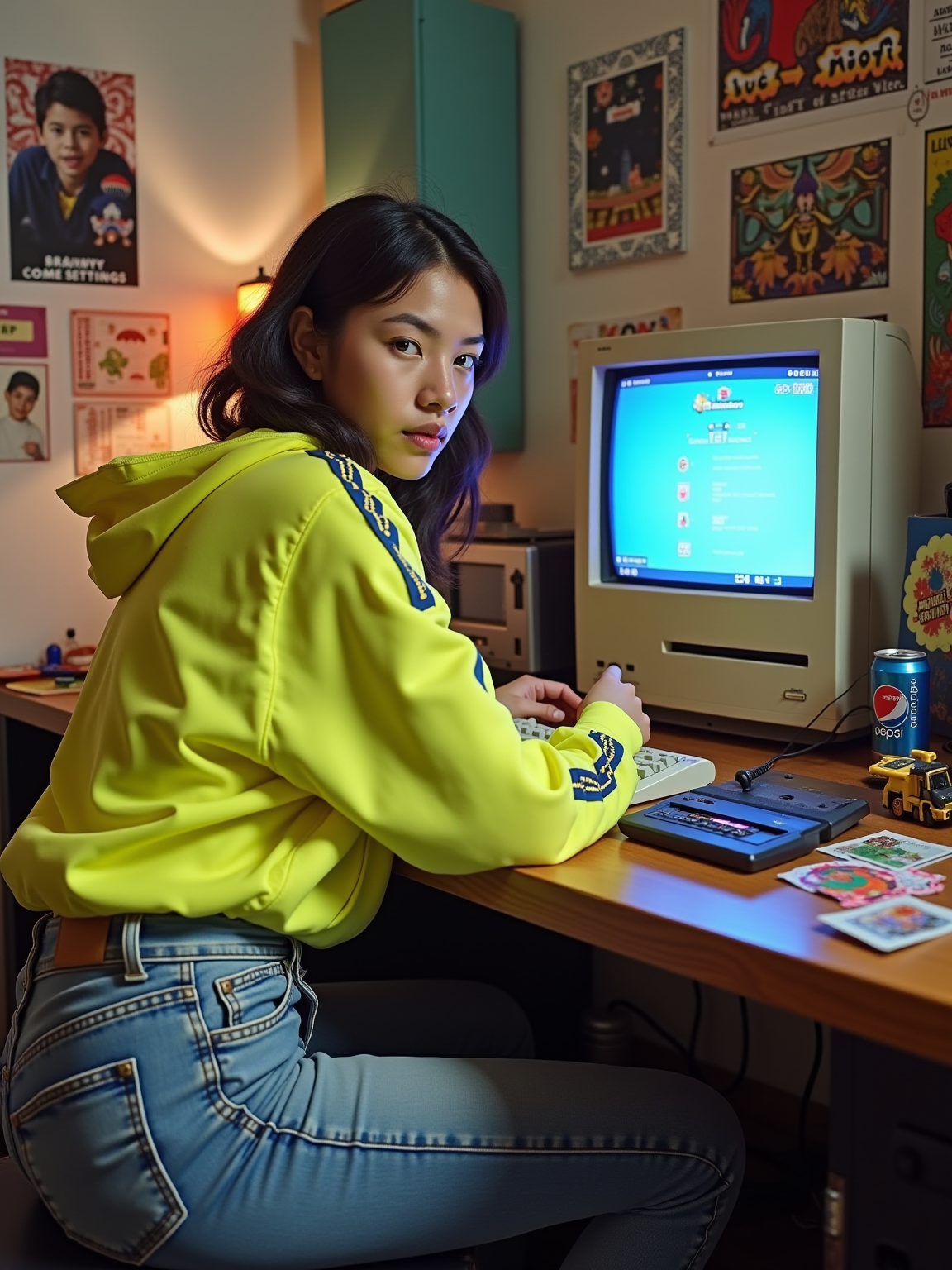 model sitting at a 80s themed desk setup. the model is dressed in 1980s fashion, wearing a neon windbreaker and high-waisted acid wash jeans, evoking a sense of nostalgia. her expression is one of curiosity and intrigue as she interacts with the old computer. large posters are pinned to the wall above the desk. To the right, a vintage computer monitor displays a pixelated game screen. The desk is cluttered with items including a joystick, a cassette player, and a calculator. A framed photograph of a child is placed beside a Pepsi can. Toys, like a toy truck and cassette cases, are scattered across the desk, along with various gaming-related stickers and cards. An adjustable desk lamp illuminates the workspace, and colorful posters and flyers decorate the surrounding walls.