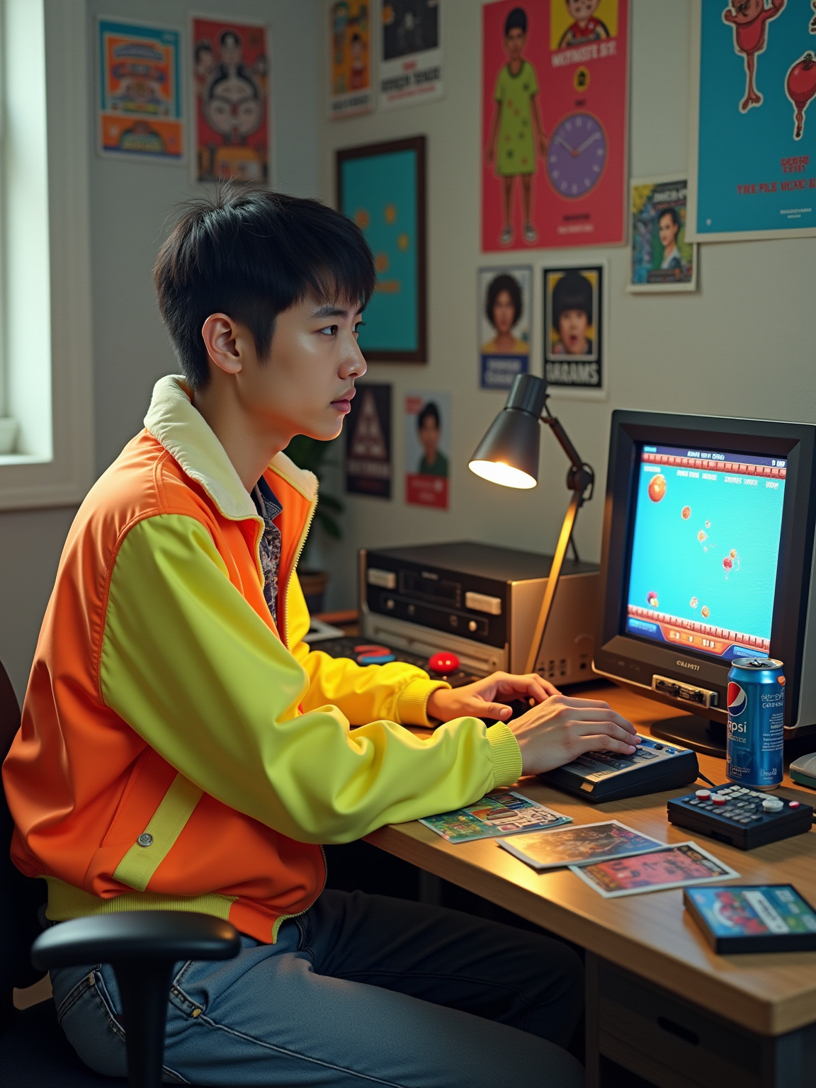 model sitting at a 80s themed desk setup. the model is dressed in 1980s fashion, wearing a neon windbreaker and high-waisted acid wash jeans, evoking a sense of nostalgia. her expression is one of curiosity and intrigue as she interacts with the old computer. large posters are pinned to the wall above the desk. To the right, a vintage computer monitor displays a pixelated game screen. The desk is cluttered with items including a joystick, a cassette player, and a calculator. A framed photograph of a child is placed beside a Pepsi can. Toys, like a toy truck and cassette cases, are scattered across the desk, along with various gaming-related stickers and cards. An adjustable desk lamp illuminates the workspace, and colorful posters and flyers decorate the surrounding walls.