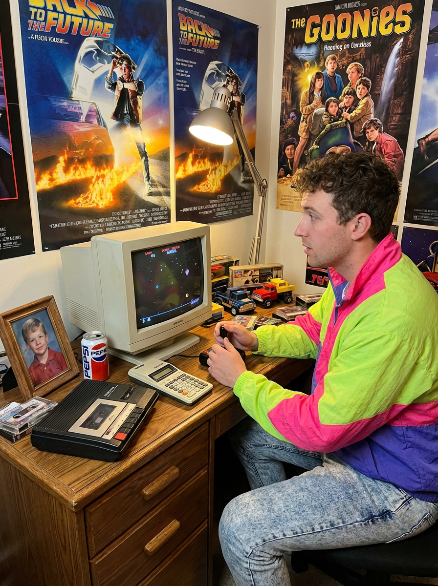 model sitting at a 80s themed desk setup. the model is dressed in 1980s fashion, wearing a neon windbreaker and high-waisted acid wash jeans, evoking a sense of nostalgia. her expression is one of curiosity and intrigue as she interacts with the old computer. large posters are pinned to the wall above the desk. To the right, a vintage computer monitor displays a pixelated game screen. The desk is cluttered with items including a joystick, a cassette player, and a calculator. A framed photograph of a child is placed beside a Pepsi can. Toys, like a toy truck and cassette cases, are scattered across the desk, along with various gaming-related stickers and cards. An adjustable desk lamp illuminates the workspace, and colorful posters and flyers decorate the surrounding walls.