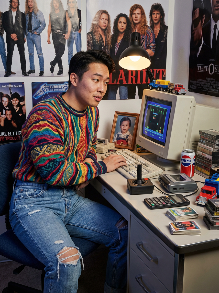 model sitting at a 90s themed desk setup. the model is dressed in 1990s fashion, wearing a colorful patterned sweater and high-waisted ripped blue jeans, evoking a sense of nostalgia. her expression is one of curiosity and intrigue as she interacts with the old computer. large posters are pinned to the wall above the desk. To the right, a vintage computer monitor displays a pixelated game screen. The desk is cluttered with items including a joystick, a cassette player, and a calculator. A framed photograph of a child is placed beside a Pepsi can. Toys, like a toy truck and cassette cases, are scattered across the desk, along with various gaming-related stickers and cards. An adjustable desk lamp illuminates the workspace, and colorful posters and flyers decorate the surrounding walls.