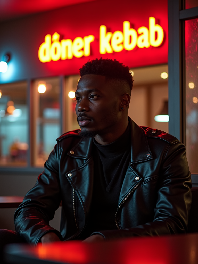 model sitting at an indoor Doner Kebab Takeaway Restaurant at night. the model wears black leather jacket. neon light say "döner kebab" in caps.