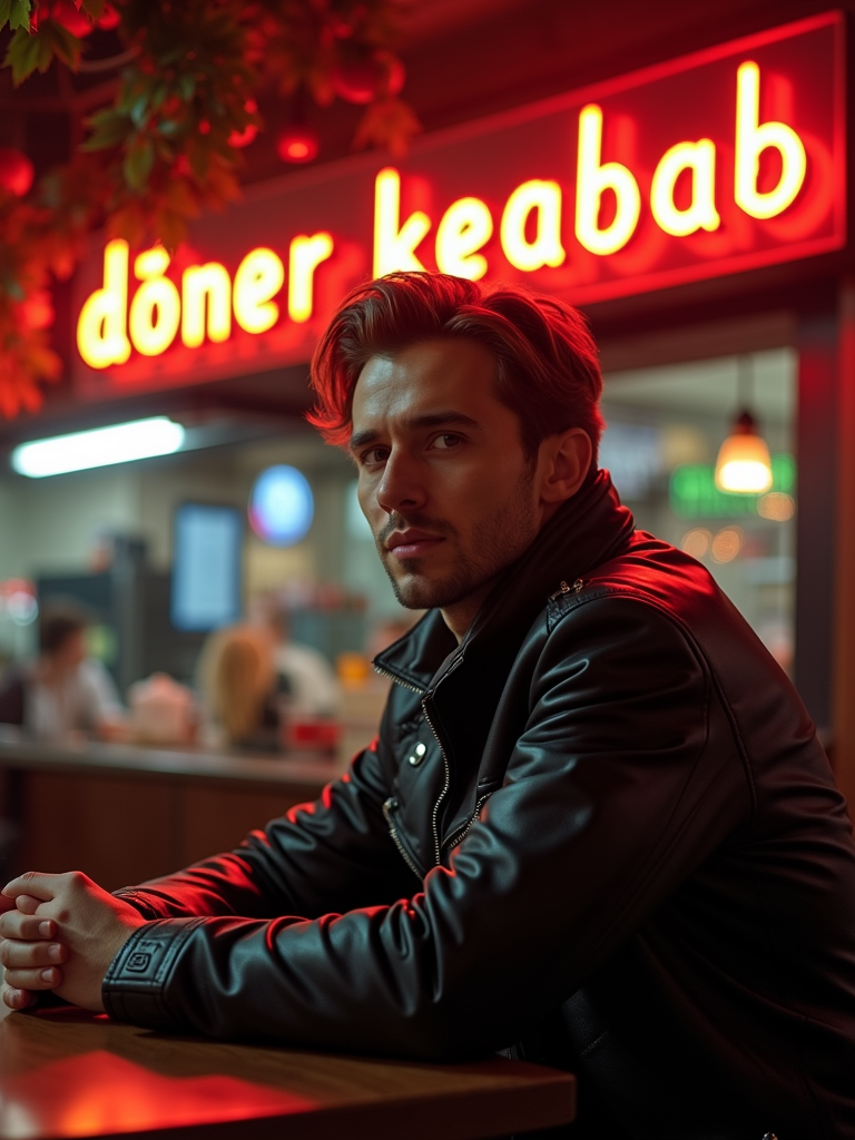 model sitting at an indoor Doner Kebab Takeaway Restaurant at night. the model wears black leather jacket. neon light say "döner kebab" in caps.