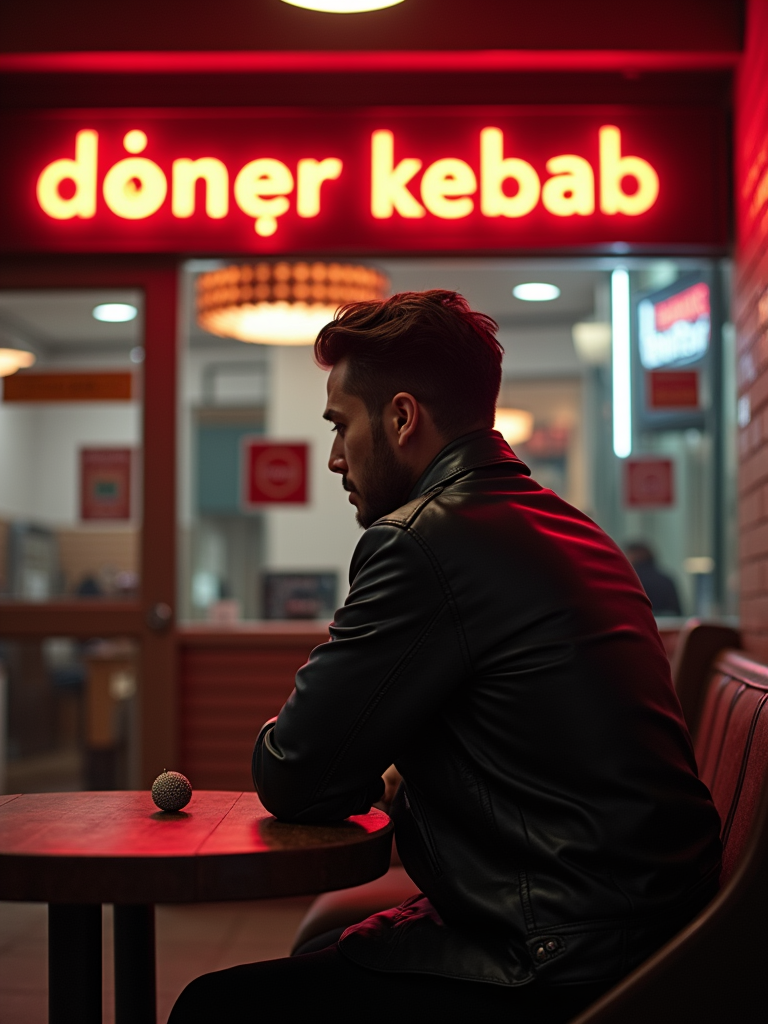model sitting at an indoor Doner Kebab Takeaway Restaurant at night. the model wears black leather jacket. neon light say "döner kebab" in caps.