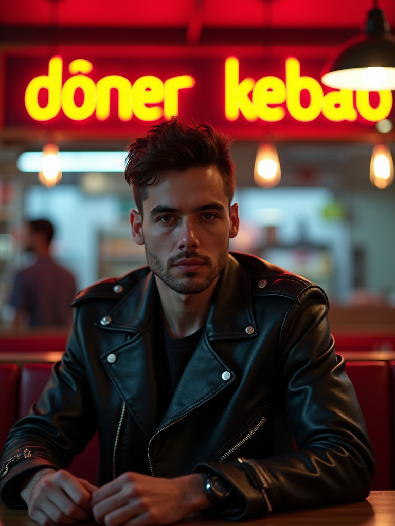 model sitting at an indoor Doner Kebab Takeaway Restaurant at night. the model wears black leather jacket. neon light say "döner kebab" in caps.