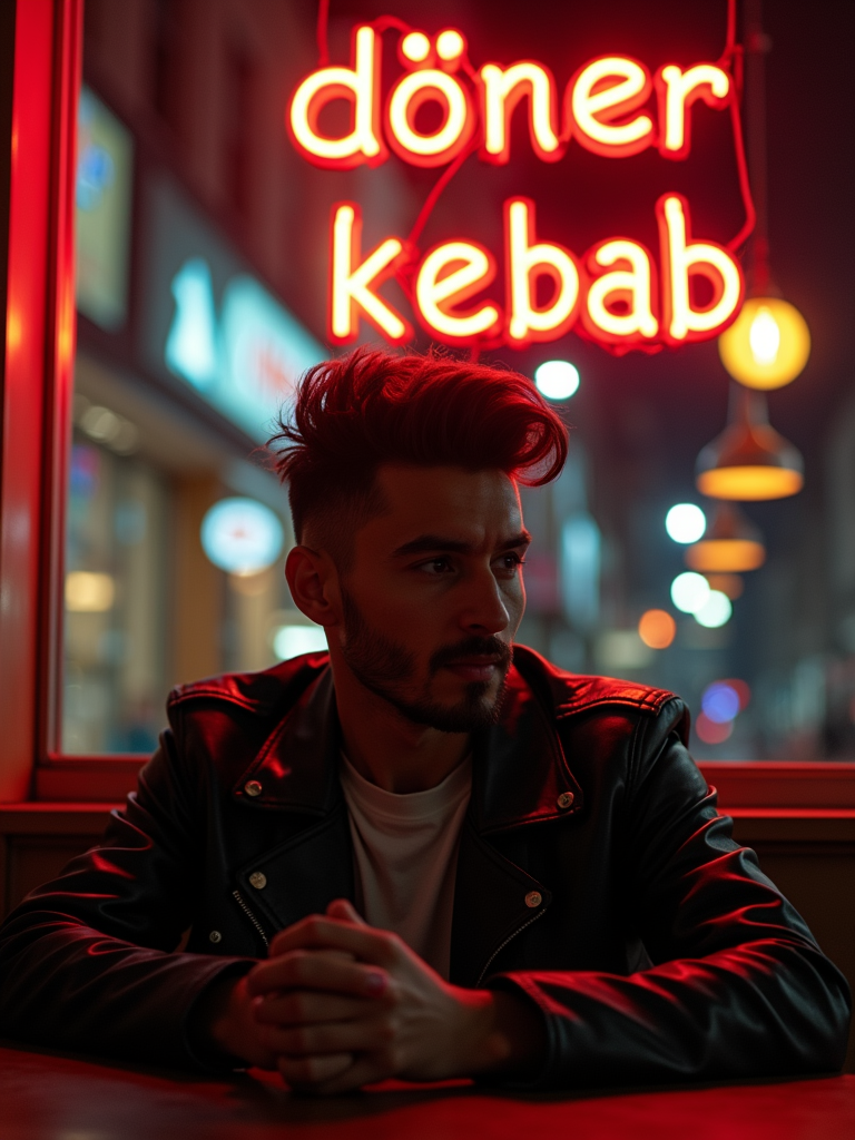 model sitting at an indoor Doner Kebab Takeaway Restaurant at night. the model wears black leather jacket. neon light say "döner kebab" in caps.