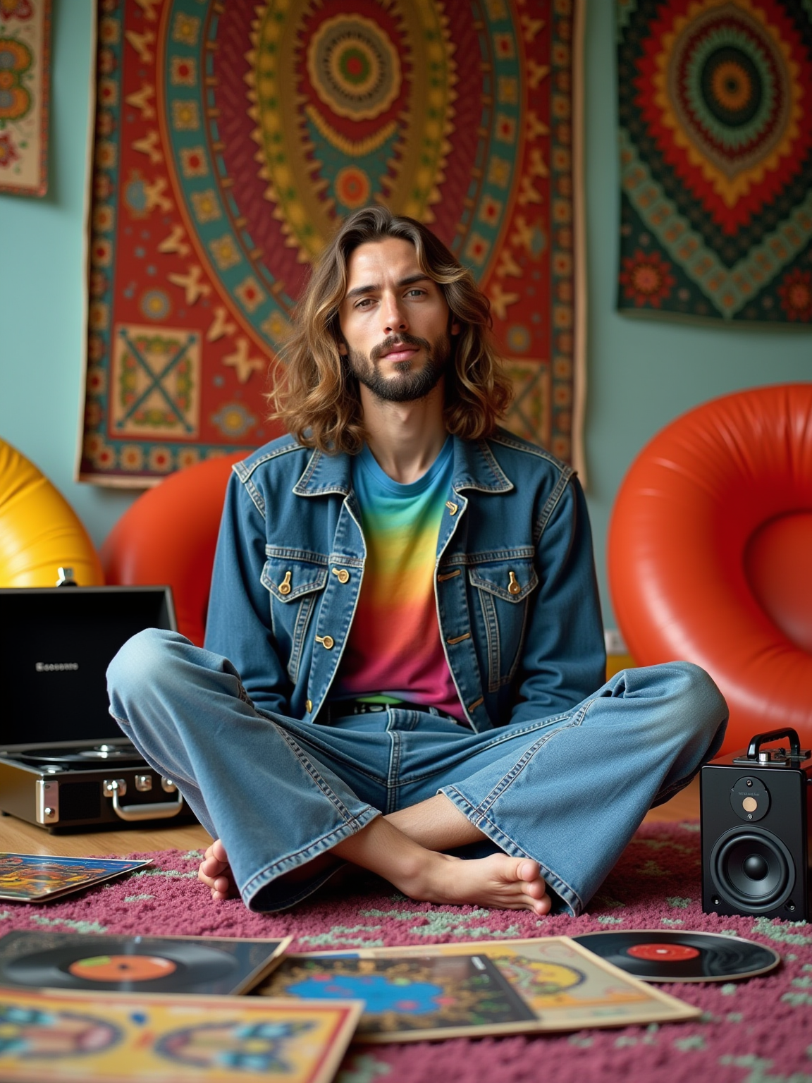 model sitting cross-legged on a colorful shag rug, wearing a denim jacket over tie-dye shirt with bell-bottom jeans, organizing a collection of Beatles and Motown singles, portable record player with detachable speakers nearby, inflatable furniture and psychedelic tapestries decorating the room