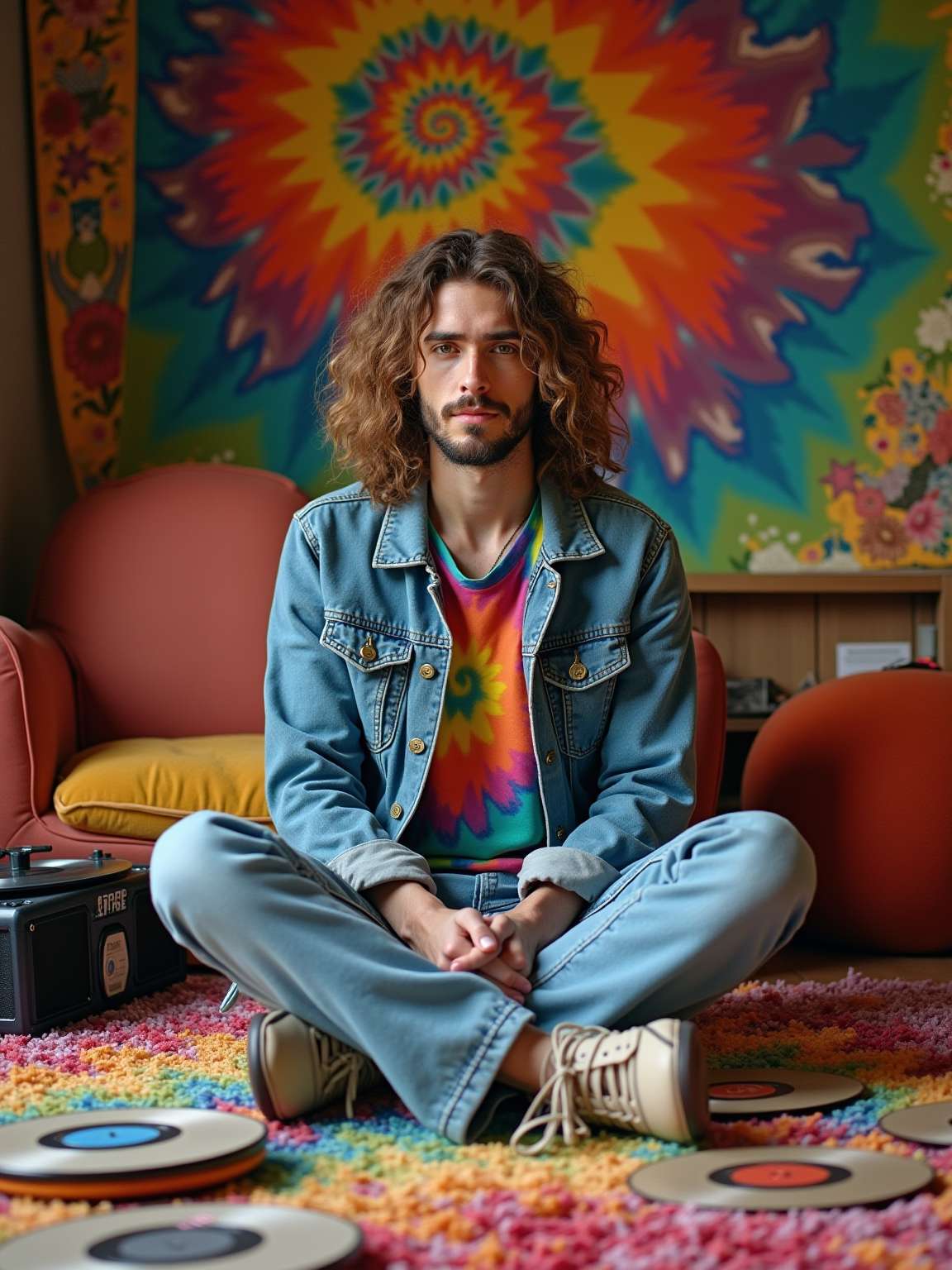model sitting cross-legged on a colorful shag rug, wearing a denim jacket over tie-dye shirt with bell-bottom jeans, organizing a collection of Beatles and Motown singles, portable record player with detachable speakers nearby, inflatable furniture and psychedelic tapestries decorating the room